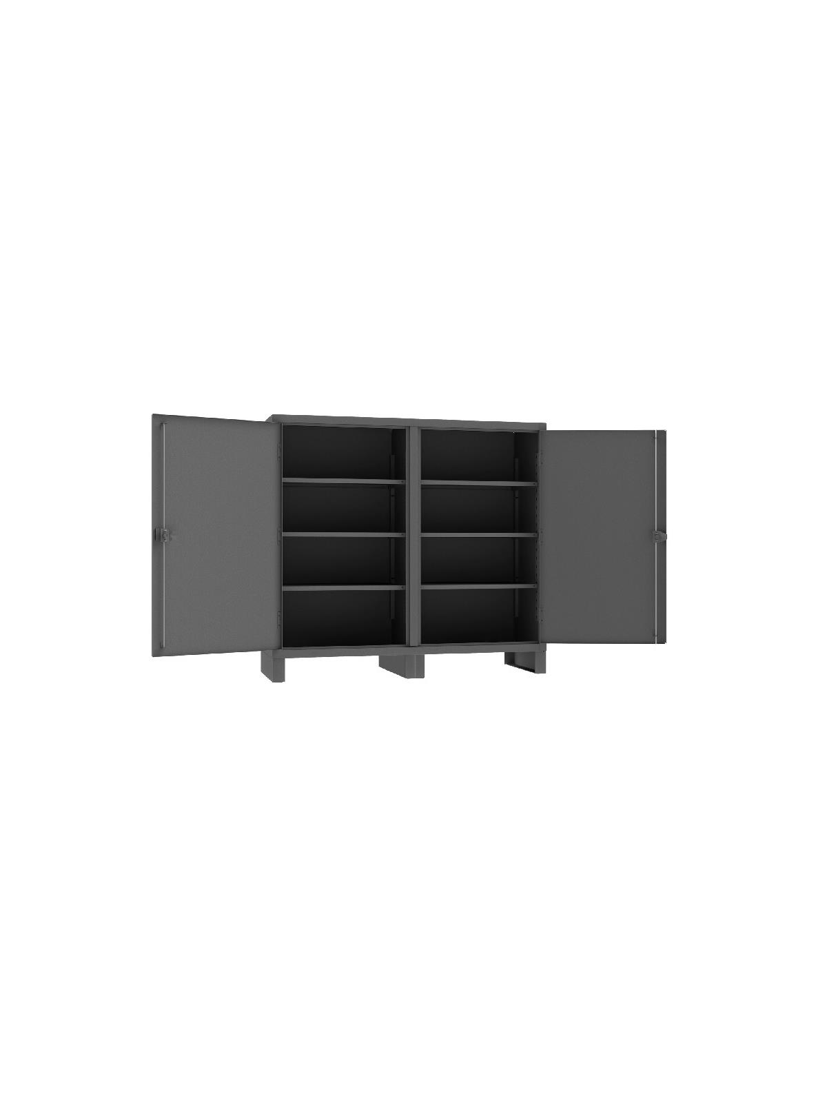 Feature rugged, all-welded 12 ga. steel construction and handsome flush door design. 4 reinforced steel shelves are adjustable on 2-1/2” centers. Includes extra heavy-duty hinge pins that secure doors to avoid sagging. Sturdy 3-point, cast steel locking handles have 3/8” dia. rods and provision for padlock (padlock not furnished).  6" high box style legs offer space for lift truck forks and can be lagged to the floor, constructed of 3/16" steel. Durable Gray powder coat finish. FOB Shipping Point.