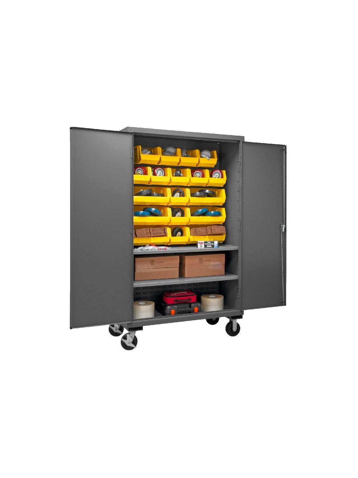 Industrial duty, all welded 16-gauge steel with 6" x 2" phenolic casters (2 rigid, 2 locking swivel). 3-point locking system with keyed handle and lock rods, 4 keys included. Side handle for easy maneuvering. Fully welded louvered panels reinforce back and hold Hook-On-Bins® and adjustable shelves rest on louvered panels and adjust on 4" centers. No tools required for installation. Hook-On-Bins® by Durham are included and install with no tools required. Gray textured powder coat finish. Available in three bin colors, Red (-1795), Blue (-5295), or Yellow (-95). FOB Shipping Point.
