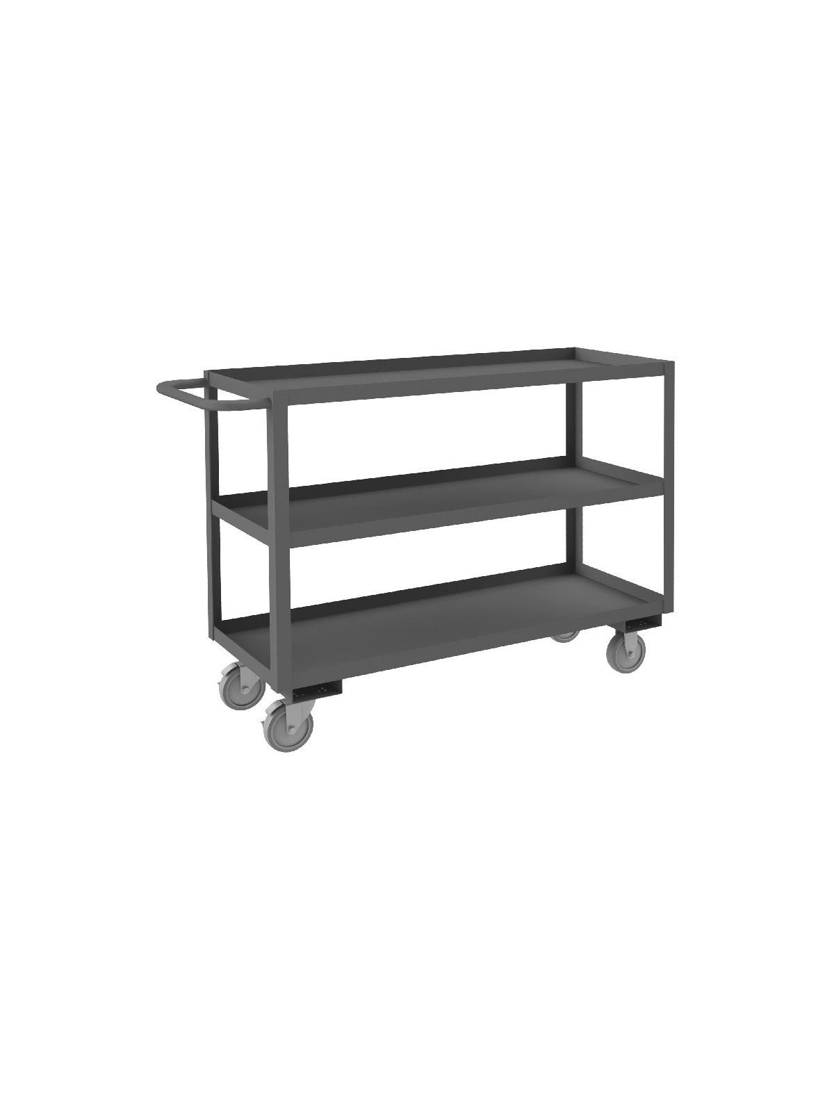 Shelf carts are constructed with 1-1/2" x 1/8" angle iron uprights for added strength. Heavy duty 14 gauge steel shelves. Sturdy tubular push handle. Perfect for transporting heavier parts or stock items. Shelf Stock Carts are available in 1,200 lbs. or 3,000 lbs. capacities. FOB Shipping Point.