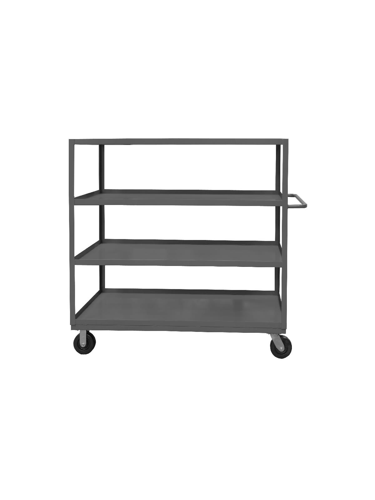 Shelf carts are constructed with 1-1/2" x 1/8" angle iron uprights for added strength. Heavy duty 14 gauge steel shelves. Sturdy tubular push handle. Perfect for transporting heavier parts or stock items. Shelf Stock Carts are available in 1,200 lbs. or 3,000 lbs. capacities. FOB Shipping Point.