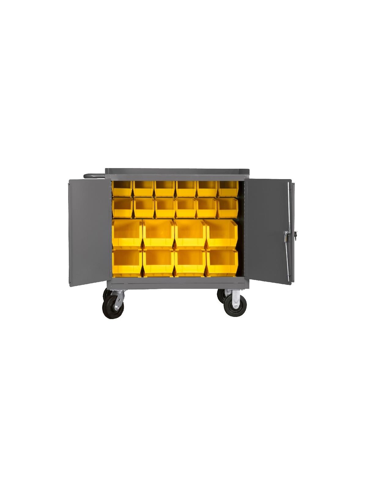 Made of heavy duty 16 ga. steel construction. Convenient sturdy work surface with back stop. Tubular push handle allows for ease of mobility. Rolls smoothly on 6" x 2" phenolic casters (2) swivel and (2) rigid. Back louvered panel accommodates Hook-On-Bins®. Doors lock securely with a 3 point locking handle and 4 keys. Durable, gray, textured powder coat finish. FOB Shipping Point.