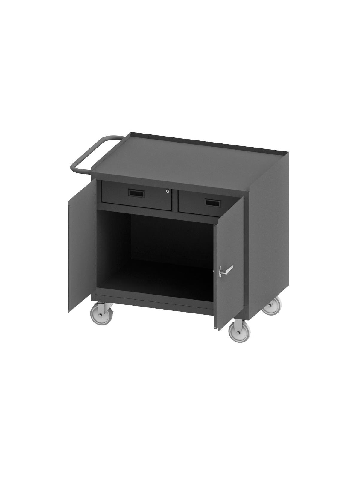 Bench cabinets are constructed of 14 gauge steel. Convenient sturdy work surface with back and end stops on the work surface prevents parts from falling off during transport (MT units not included). Tubular handle for easy maneuverability. Cabinet doors have a 3 point locking system with 4 keys. Rolls smoothly on 5" polyurethane bolt-on casters, (2) swivel with side brakes and (2) rigid. 36"W model has 1,200 lbs. capacity. 48"W model has 2,000 lbs. capacity and includes a floor lock to keep the unit in place while you work. FOB Shipping Point.