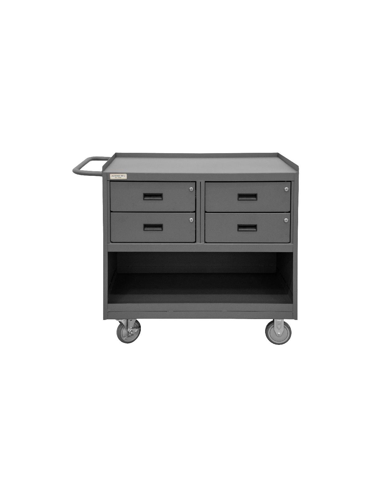 Bench cabinets are constructed of 14 gauge steel. Convenient sturdy work surface with back and end stops on the work surface prevents parts from falling off during transport (MT units not included). Tubular handle for easy maneuverability. Cabinet doors have a 3 point locking system with 4 keys. Rolls smoothly on 5" polyurethane bolt-on casters, (2) swivel with side brakes and (2) rigid. 36"W model has 1,200 lbs. capacity. 48"W model has 2,000 lbs. capacity and includes a floor lock to keep the unit in place while you work. FOB Shipping Point.