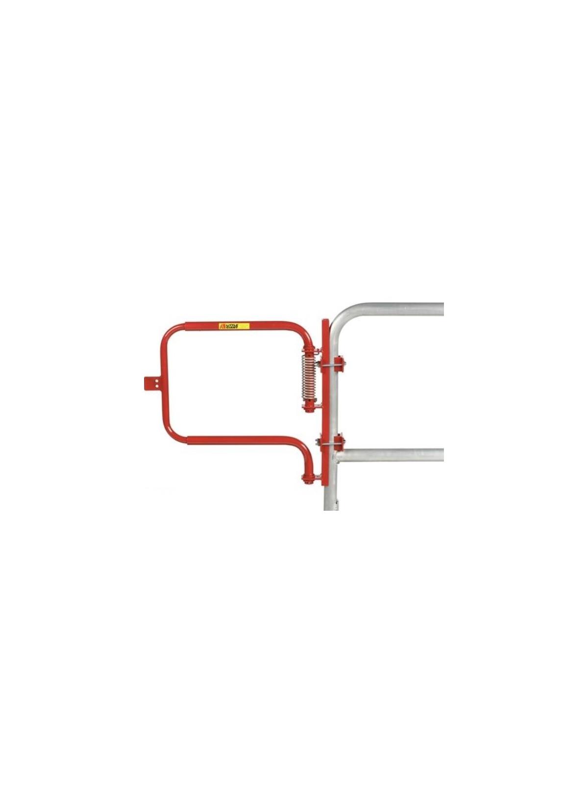 Adjustable width 22-1/2" to 36". Set screws secure at desired width. Stainless steel torsion spring closes the gate automatically. Spring is tension adjustable and reversible. Helps you comply with OSHA 1910.29 requirements. Powder coated red finish (except spring). Outside tubing 1.37" OD x 12 gauge wall. Mounting channel is 2" x 1" with two mounting holes (hardware not included). Gate with easy mount kit makes it easy to mount directly on your existing hand rail. Two bolt together clamps hold unit securely to hand rail. No drilling required. FOB Shipping Point.