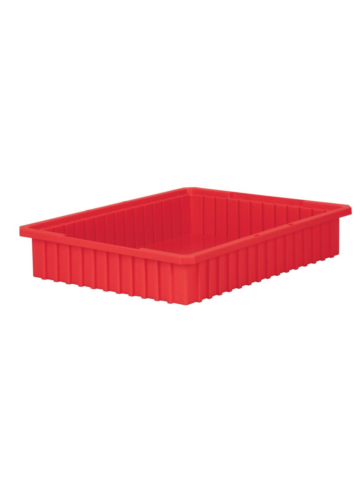 Intersecting dividers allow the container to be subdivided in separate compartments as small as 1-1/8" sq. Injection-molded from high density polyethylene -- resists most solvents and chemicals. Compatible with most racks, shelving and automated material handling equipment. Available in Red, Blue, or Gray. Dividers and lids sold separately. FOB Shipping Point.