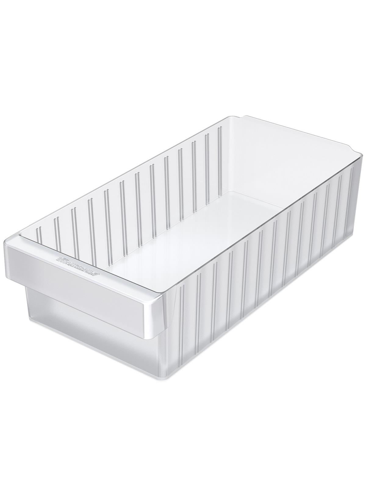 Offered in 12" or 18" depths to work with compatible shelving. Easy to label and color code inventory for quick identification of parts and supplies. Drawers can be stacked to optimize space. Wide front handle for easy gripping when AkroDrawers are loaded or contain heavy contents. Can be used with available shelving, racks, mobile carts or can be used by themselves. Sturdy back stop tab ensures AkroDrawers can hang securely from shelves. Dividers are available to keep contents neatly separated in drawers. Available in Blue, Gray, Yellow, Red and Clear - Minimum order required. FOB Shipping Point.