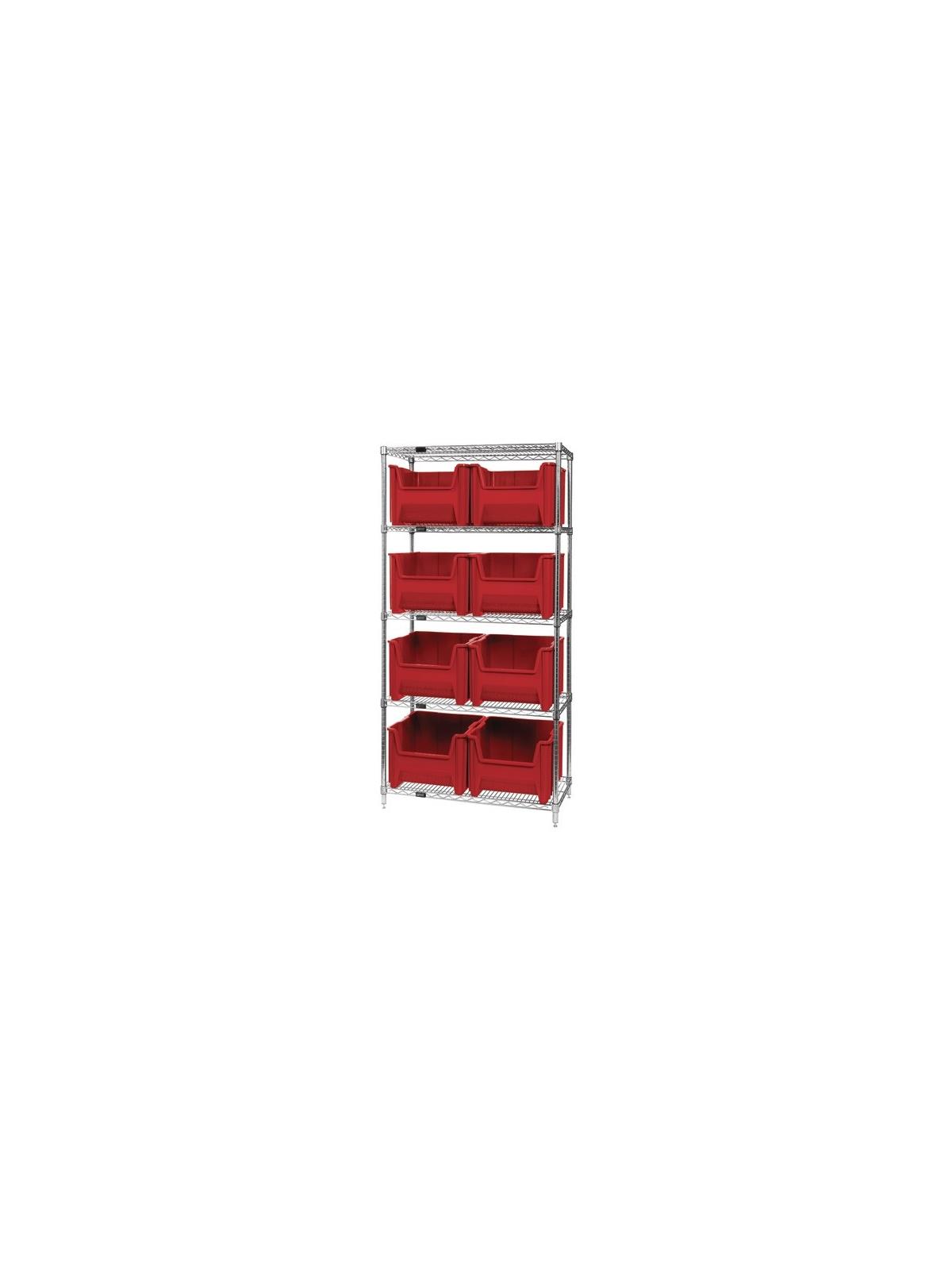 Combine stylish chrome shelving and parts organizing bins. Sturdy shelving unit supports loads up to 800 lbs. Choice of bins. Easy to assemble. Giant Hopper Bins are available in Gray, Blue, or Red. FOB Shipping Point.