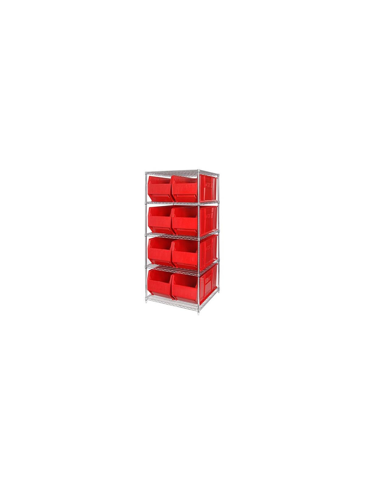 Combine stylish chrome shelving and parts organizing bins. Sturdy shelving unit supports loads up to 800 lbs. Choice of bins. Easy to assemble. Hulk Containers are available in Blue, Red and Yellow. FOB Shipping Point.