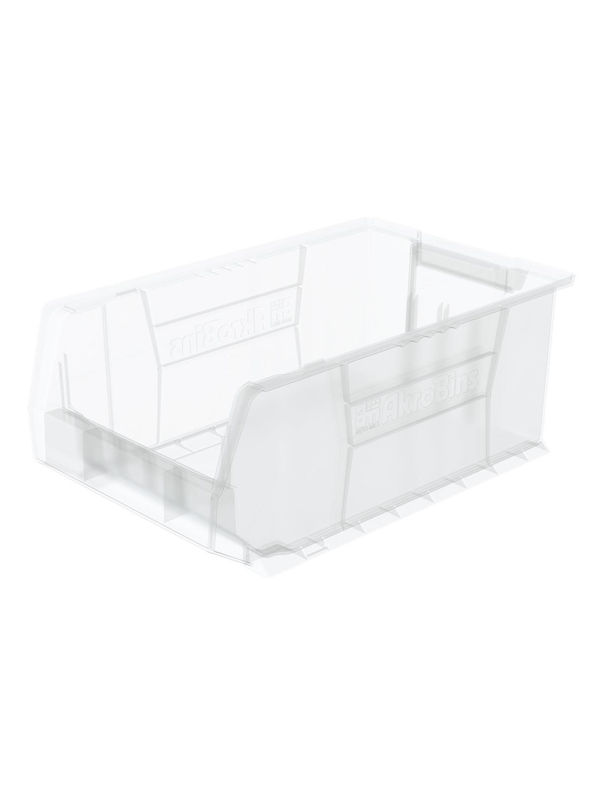 20", 24" and 30" Deep Clear Bins for Super-Size Storage. Large capacity storage bins for organizing heavy or bulky items. Heavy-duty bins molded in clear polypropylene. Extra large stacking containers feature anti-slide stop to prevent bins from shifting forward. Reinforced side ribs add strength and prevent spreading when stacked or loaded. Optional lids and dividers available. FOB Shipping Point.