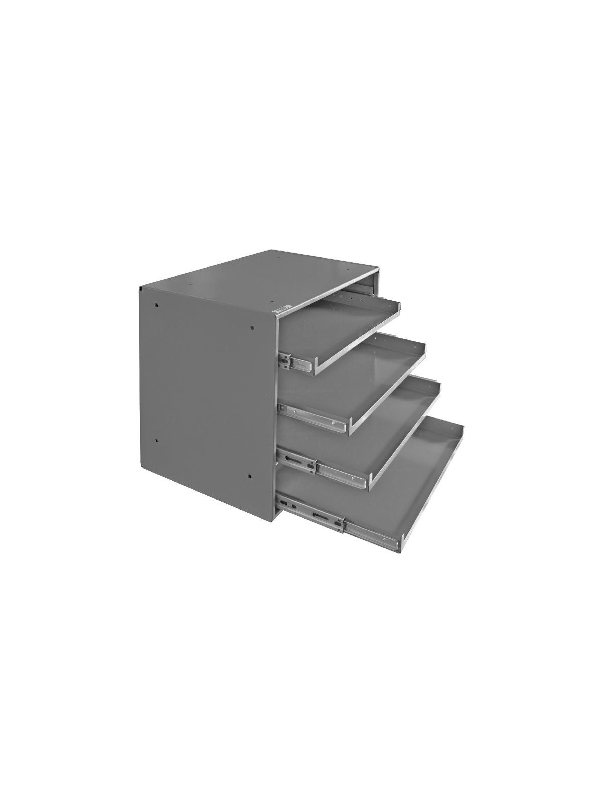 Efficient storage and organization for a variety of parts and components. Each compartment box interior is manufactured of polypropylene with scooped bottoms, both front and back for easy parts removal. Rugged steel, all-welded cabinets are reinforced for rigidity. Use on the workbench, counter, or carry to the job site with convenient thumb-grip handles. Easy Glide Slide Racks hold up to 40 lbs. per cradle. The Heavy Duty Bearing Slide Racks hold up to 75 lbs. per cradle. Finished in acid and rust resistant Gray powder coating. Order cabinets to accommodate 2, 4, or 6 boxes. Compartment boxes and bases sold separately, compartment boxes sold in case quantities. FOB Shipping Point.
