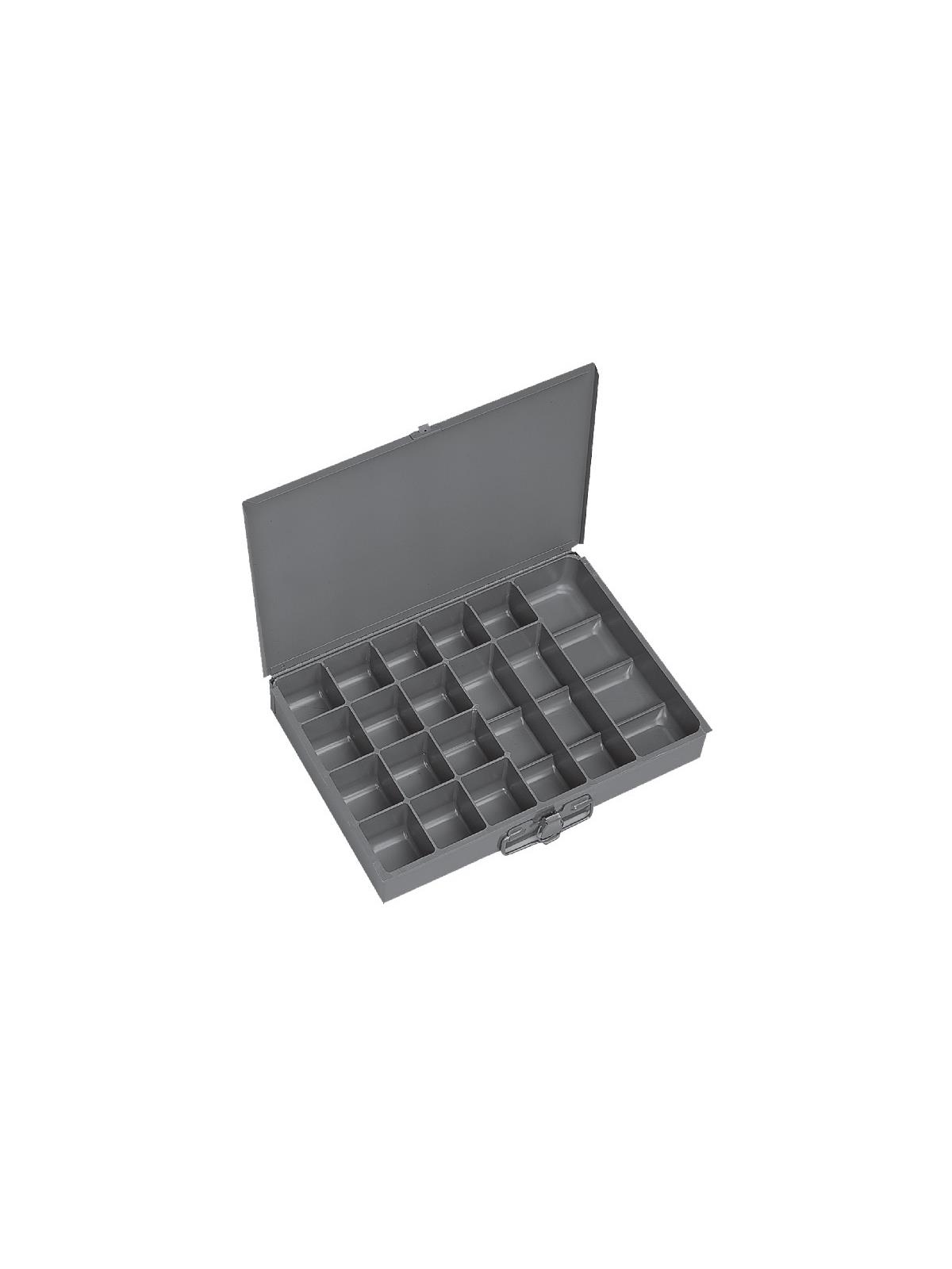 Efficient storage and organization for a variety of parts and components. Each compartment box interior is manufactured of polypropylene with scooped bottoms, both front and back for easy parts removal. Rugged steel, all-welded cabinets are reinforced for rigidity. Use on the workbench, counter or carry to the job site with convenient thumb-grip handles. Finished in acid and rust resistant Gray powder coating. FOB Shipping Point.