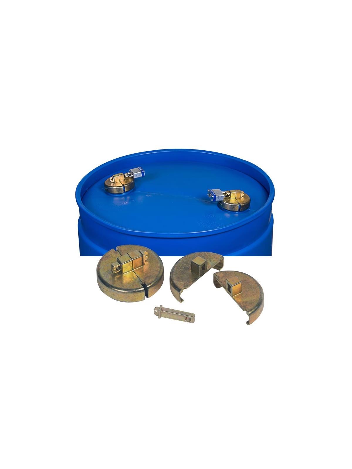 Drum locks are a cost effective solution to controlling storage concerns for all types of liquids, semi-liquids, and powders that come in standard drums. Made of corrosion resistant, non-sparking zinc die cast, the units easily install around the drum bung glange with no risk of cross threading. Sold as pairs, these drum locks fit the most popular styles of steel and plastic 55-gallon drums. The steel set includes two units; one to fit over the 2" NPT plug, and the other to fit over the 3/4" NPT plug. The plastic set includes two units which fit over both 2" plugs. FOB Shipping Point.