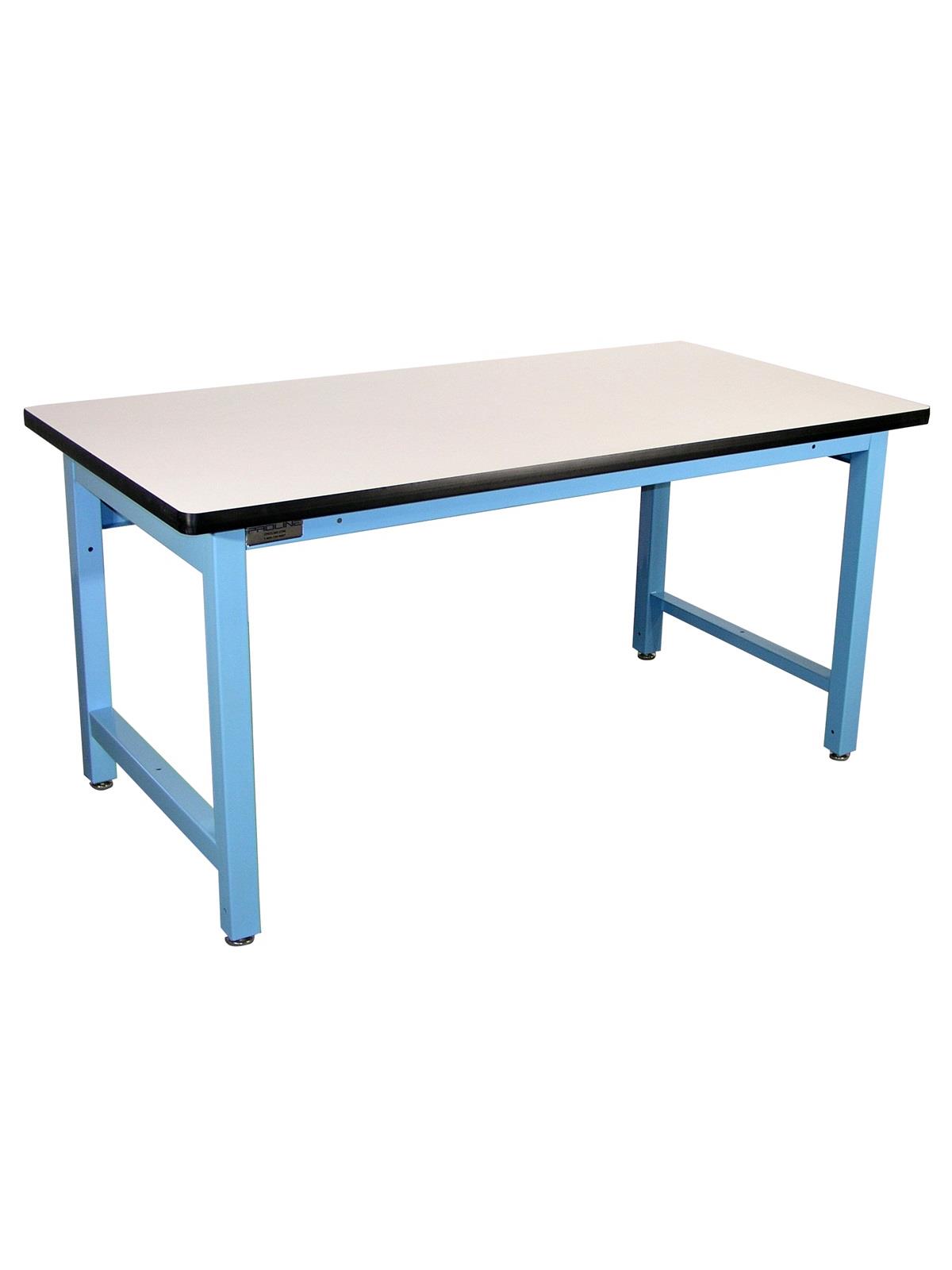 Handsome work station provides efficient pull-pin height adjustment. Industrial grade features include 16 ga. 2" square legs, 2" thick front and 8" thick back rails. Safely handles 1000 lb capacity loads.