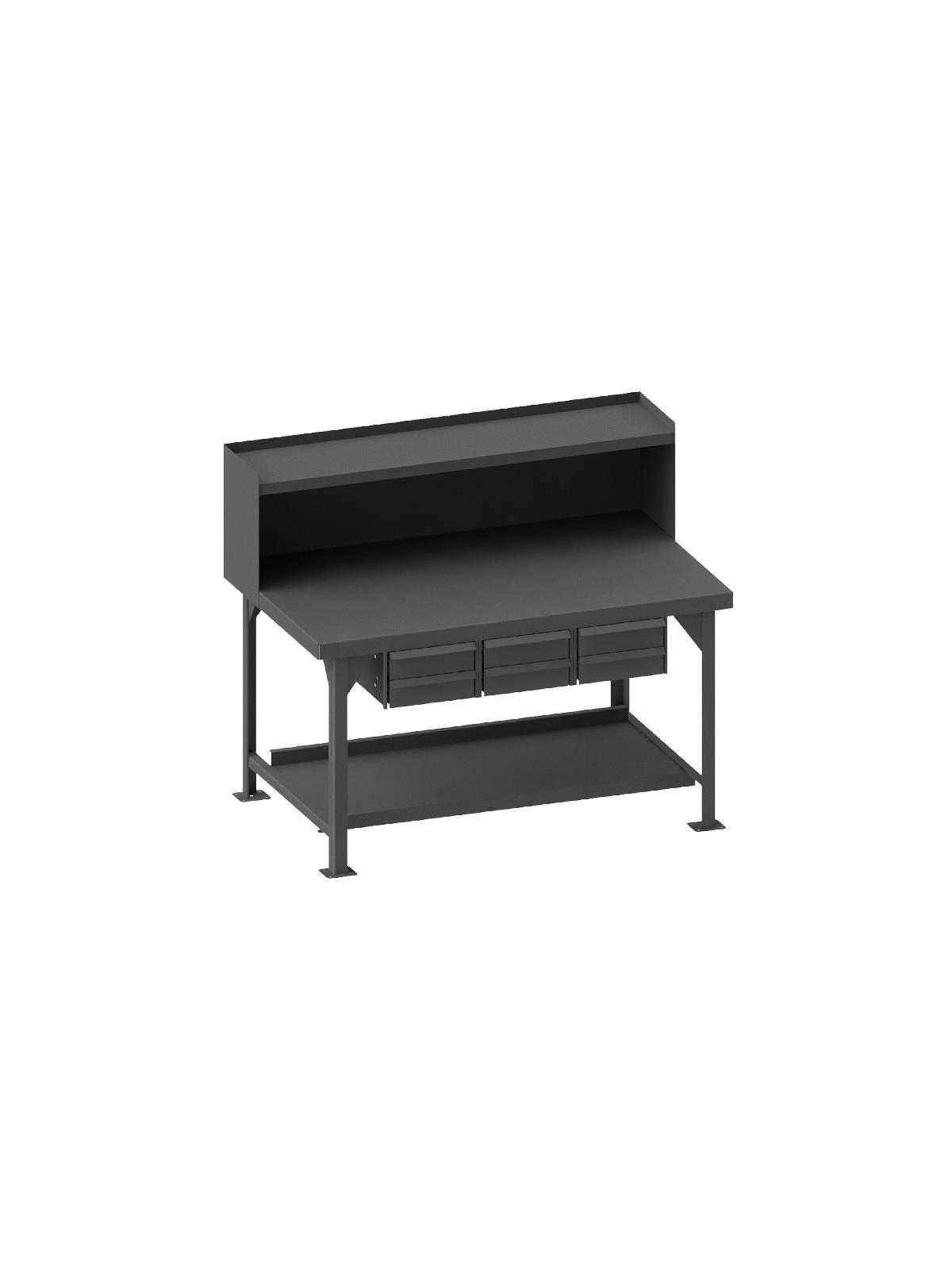 Products with top shelf risers used as shelf and back splash. See Related Items tab for Drawer for Durham Work Benches.
