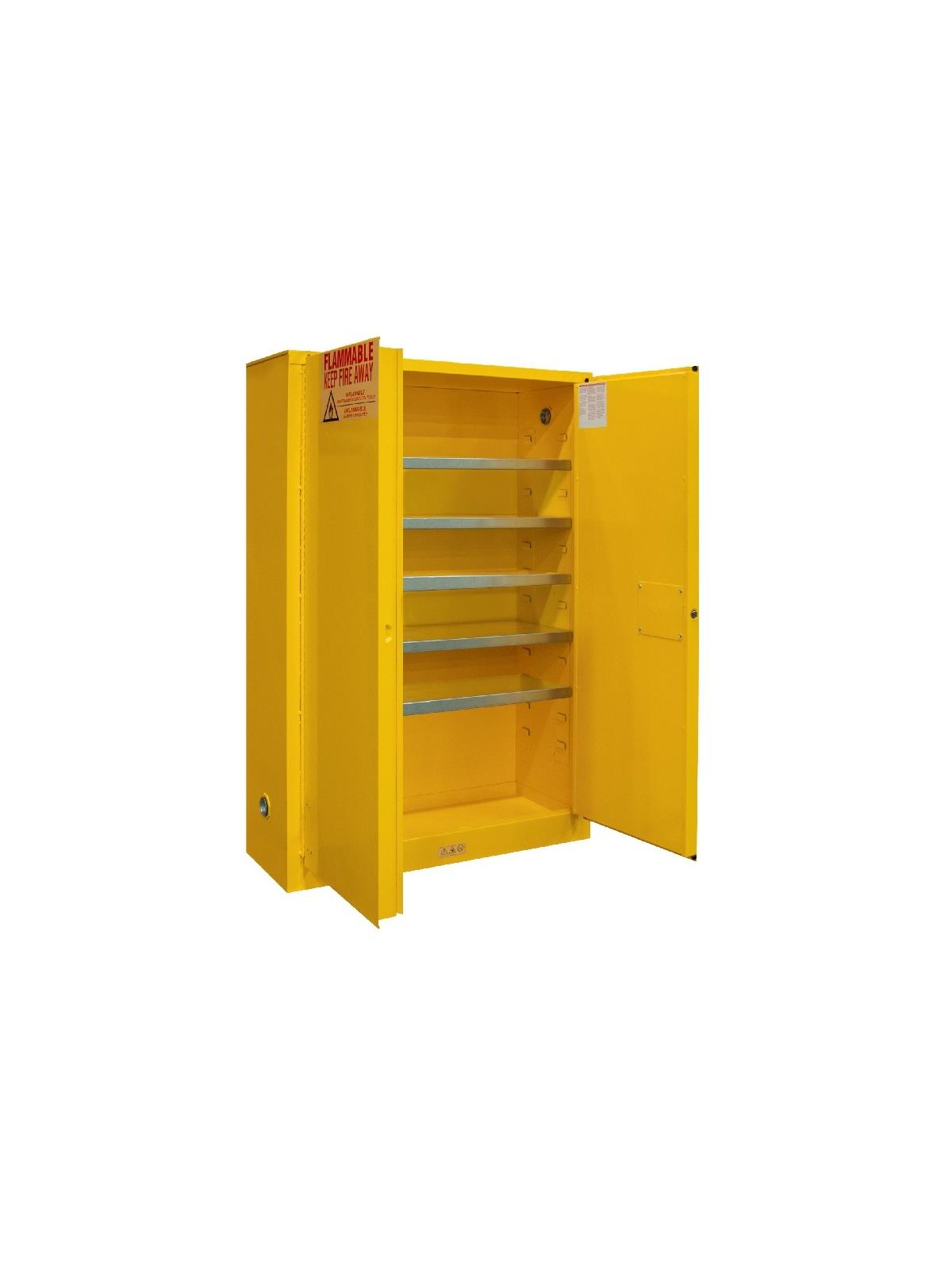 Flammable Storage Cabinets are required by OSHA and UFC in commercial and industrial facilities where flammable liquids are used and stored. Cabinets feature recessed lockable paddle latch and 3 point locking systems which greatly improves security. Bunged air vents on each side of the cabinet allows for greater ventilation. Constructed of all welded Heavy Duty Steel.