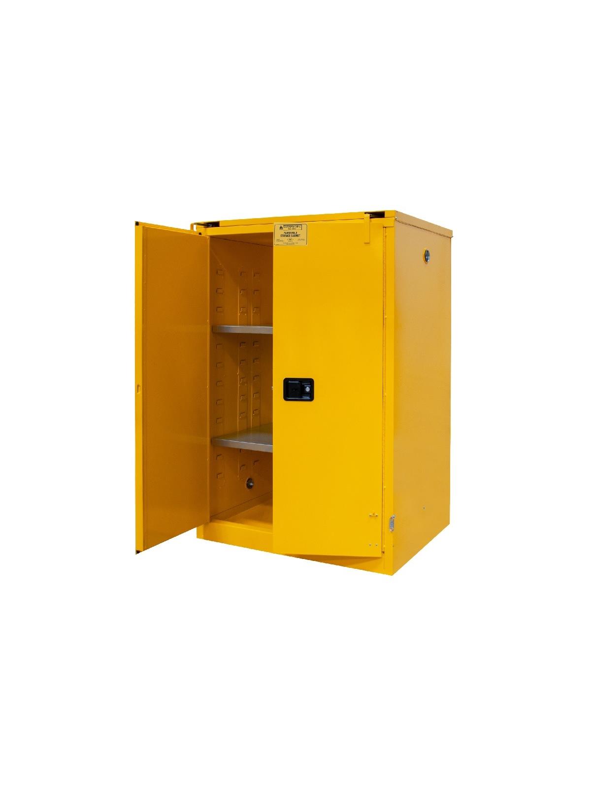 Flammable Storage Cabinets are required by OSHA and UFC in commercial and industrial facilities where flammable liquids are used and stored. Cabinets feature recessed lockable paddle latch and 3 point locking systems which greatly improves security. Bunged air vents on each side of the cabinet allows for greater ventilation. Constructed of all welded Heavy Duty Steel.
