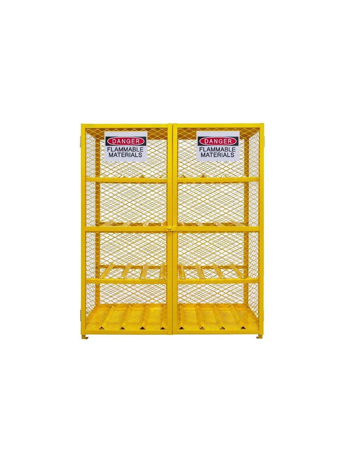 Lockable cabinets store cylinders of fuel, LP gases and other flammable materials on easy-to-access cylinder cradles. "DANGER FLAMMABLE MATERIALS" signs on each door. Magnetic catch keeps doors safely shut when not locked. Heavy-duty butt hinges keep doors from sagging. Includes padlock hasp to secure contents - padlock not furnished. Made of sturdy 1-1/2" x 1/8" angle iron frame. Pre-drilled holes for lagging to floor. Durable, rust and acid resistant safety Yellow powder coat finish. When used properly, units are in full compliance with OSHA and NFPA standards. FOB Shipping Point.