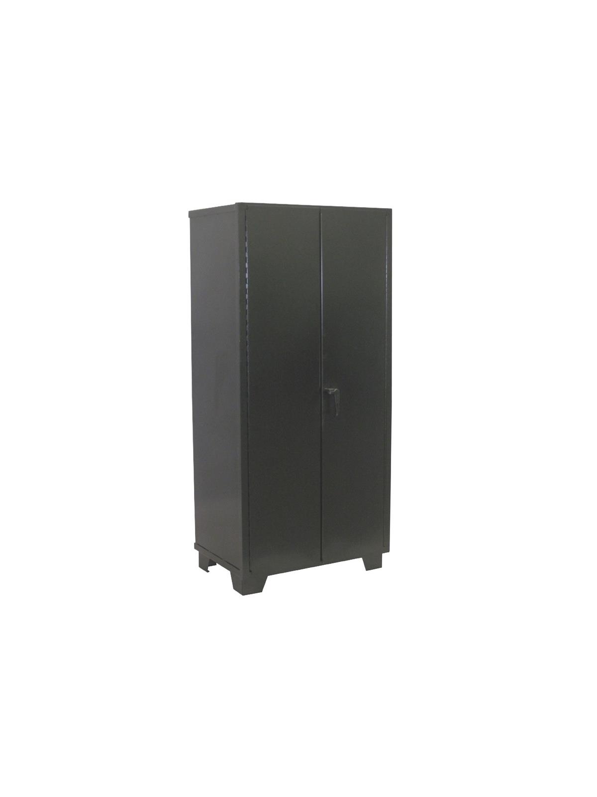 All welded heavy duty 14 gauge construction. Lockable doors, lever handle, and 3-point locking system. Handle does not include padlock. Manual doors open 180°. Four durable 14 ga. steel shelves adjust on 2-1/2" centers. 1000 lb. capacity per shelf. 4" H. legs allow for movement of empty unit with fork lift truck. Overall height - 78". Powder coat black finish. FOB Shipping Point.