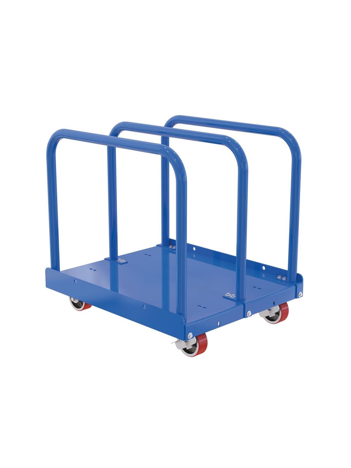 Heavy-Duty Panel Cart is the perfect panel cart for transporting plywood, drywall, paneling, doors, etc. Baked-in-powder-coated blue finish for toughness. Features a side retainer lip that keeps cargo on the deck. Two rigid and two swivel with brakes 5 x 2" poly-on-steel casters included. Overall height is 34". FOB Shipping Point.