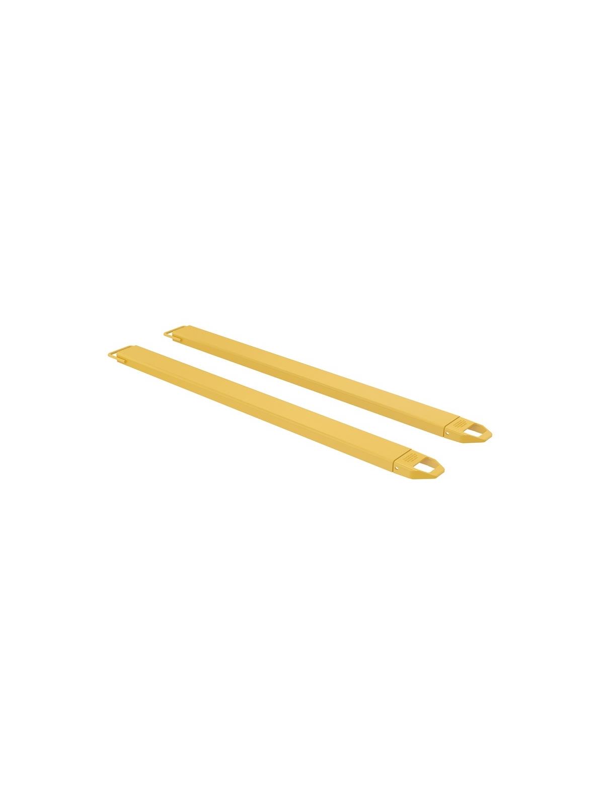 Rugged and durable welded steel construction with cast steel fork tips. Steel retaining strap prevents fork extensions from sliding off forks during use. Extensions are put on by sliding them up the fork at a 45° angle. OSHA regulations require that extensions are no more than 150% of the existing fork length. Powder coat Yellow finish. FOB Shipping Point.