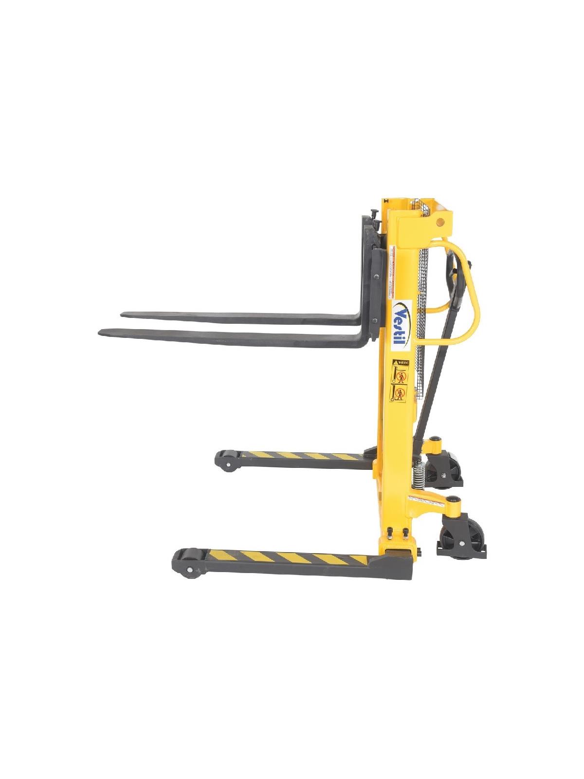 Manual Hydraulic Hand Pump Stackers are sturdy and compact to fit through most standard doors. Forks are raised by manual hydraulic hand pump operation and released by a lever situated on the handle. 3/4" lift per handle pump. NM stands for narrow mast.