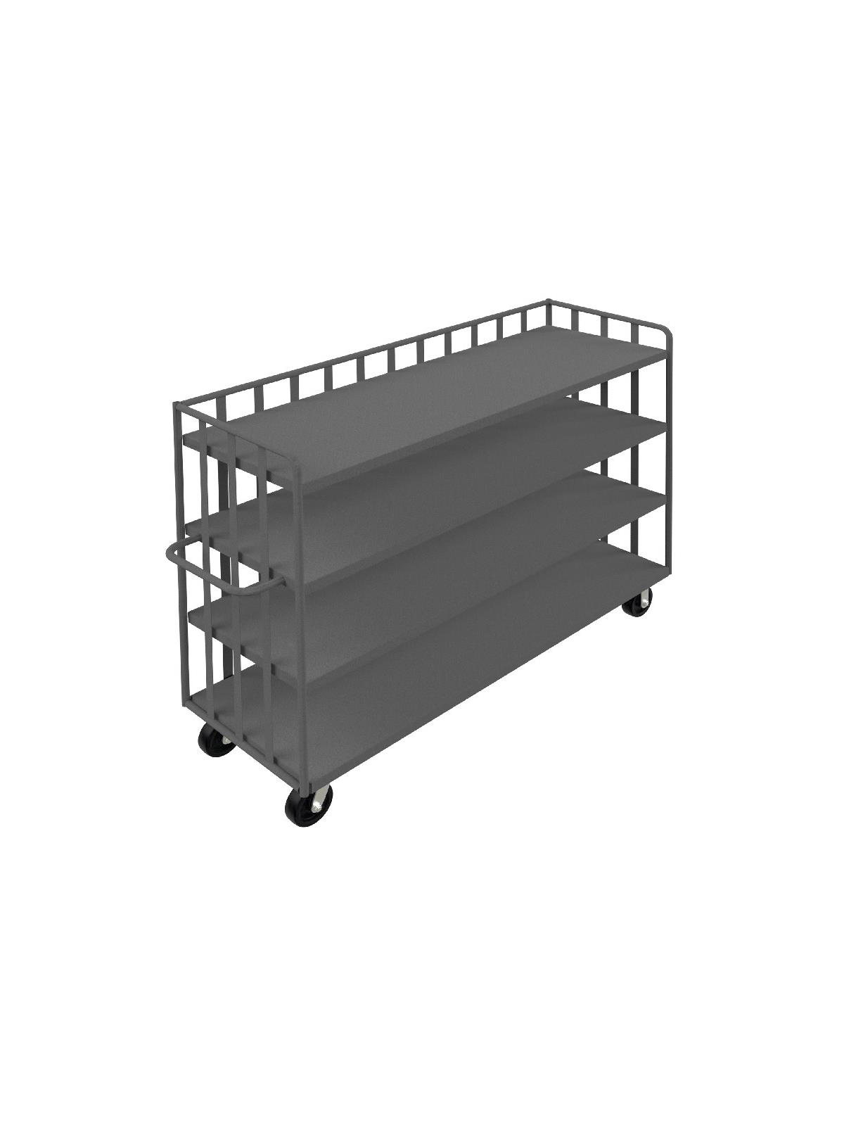 Built for heavy 2000 lb. loads. Frame is made from 1" steel tubing. 1/2" rods on sides and back. 14" clearance between shelves. Steel shelves slope 1" from front to rear preventing contents from falling off during transport Shelves are made of 14 ga. steel. Smooth rolling 6" x 2" phenolic bolt-on casters, 2 swivel, 2 rigid. All units are 58"H. Gray powder coat finish. FOB Shipping Point.