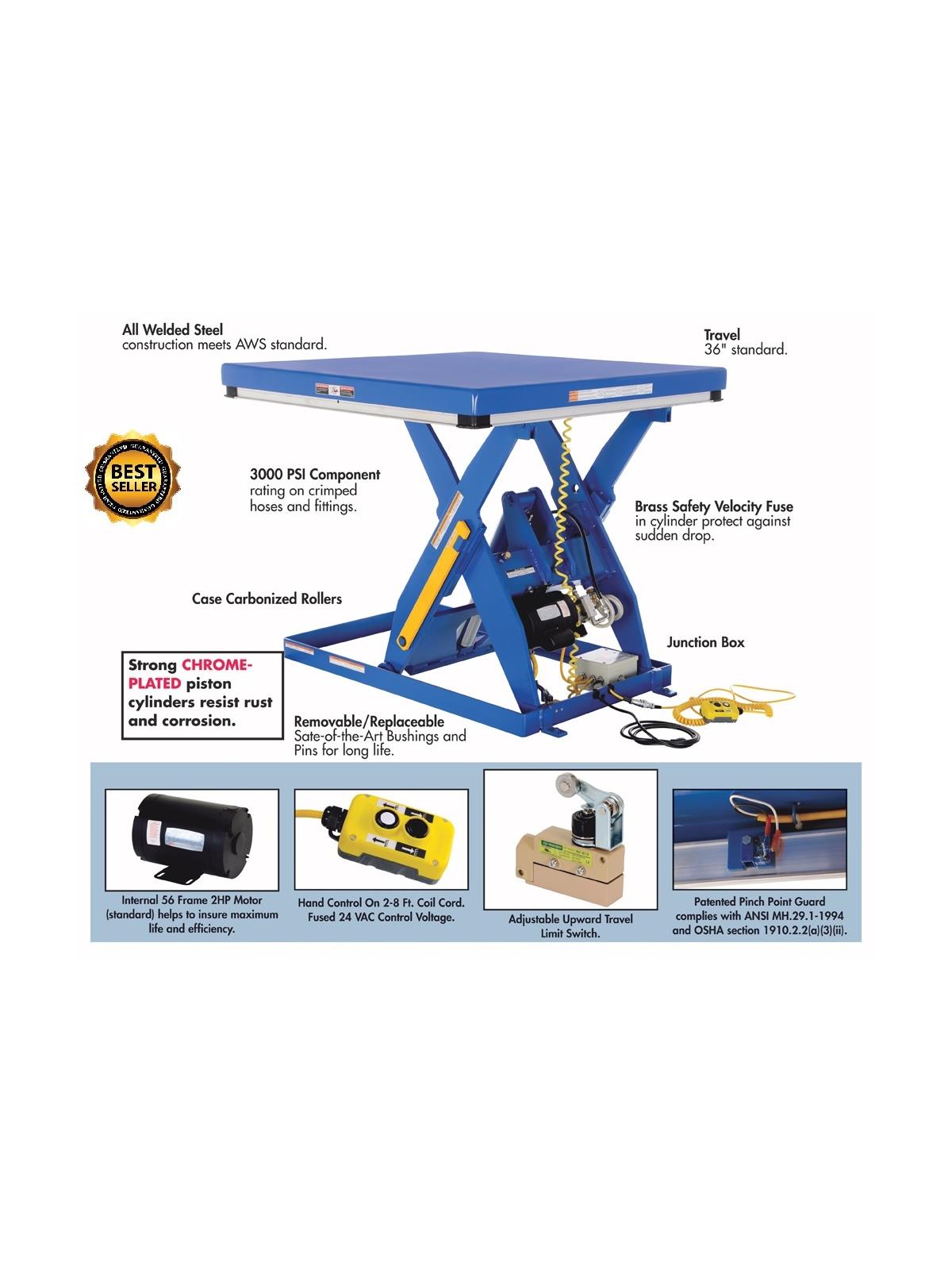Hardened pins reduce wear. Strong chrome-plated piston cylinders resist rust and corrosion. Cylinder is honed hydraulic tubing. Safety toe guard automatically stops platform if lift comes down on toe or other objects - meets OSHA requirements. Emergency lockup automatically locks platform if hydraulic pressure is inadvertently lost.  FOB Shipping Point.