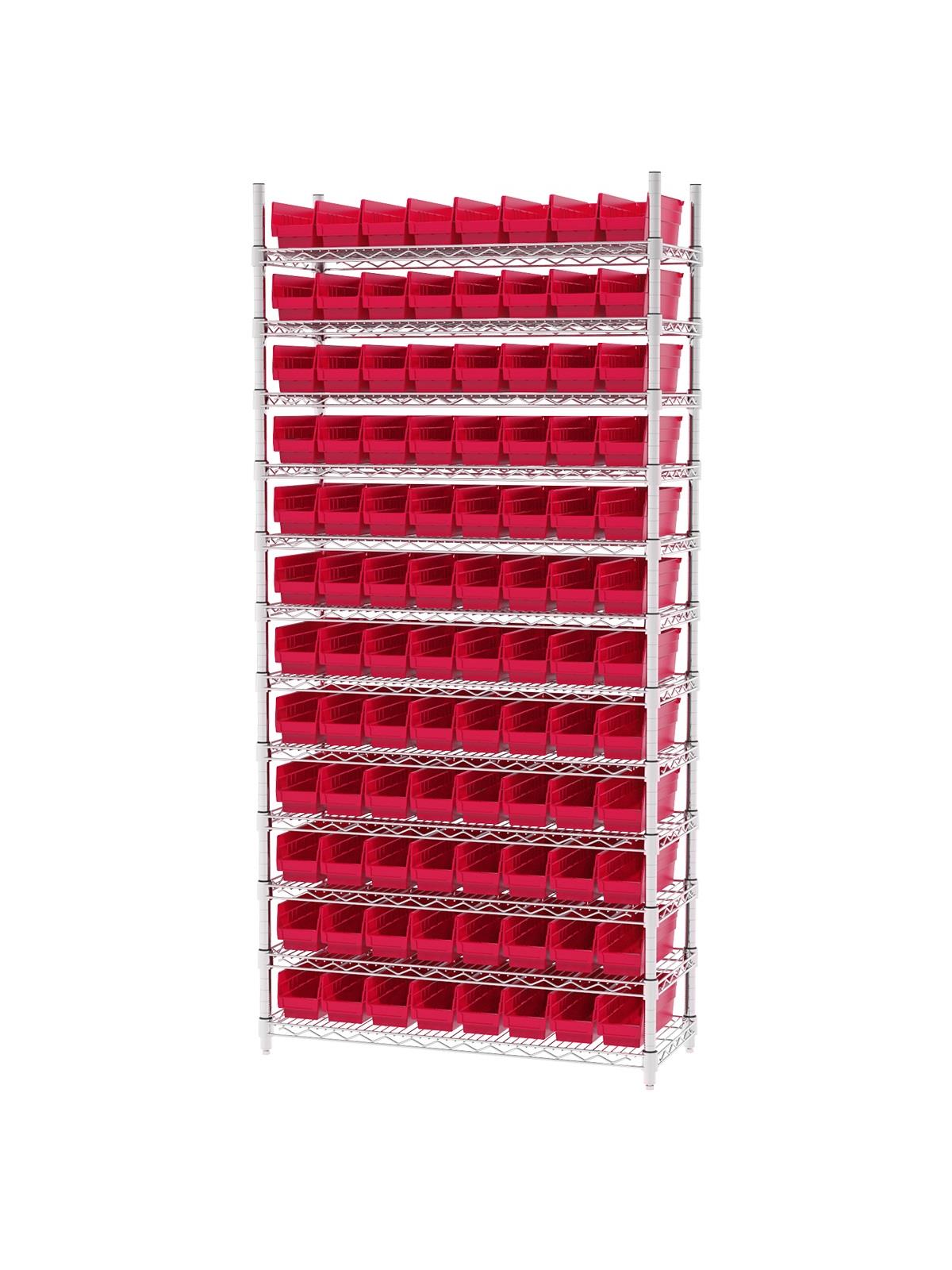 Shelf Bin Wire Systems can be configured for use with 36, 48, 60 or 96 bins providing a versatile system for storage and material handling. Durable and strong polypropylene shelf bins outlast corrugated bins. Bins available in Blue, Red, Yellow, or Semi-Clear. FOB Shipping Point.
