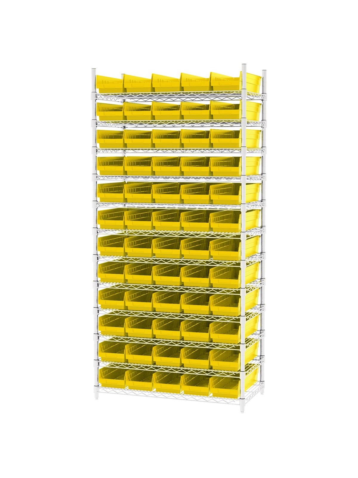 Shelf Bin Wire Systems can be configured for use with 36, 48, 60 or 96 bins providing a versatile system for storage and material handling. Durable and strong polypropylene shelf bins outlast corrugated bins. Bins available in Blue, Red, Yellow, or Semi-Clear. FOB Shipping Point.