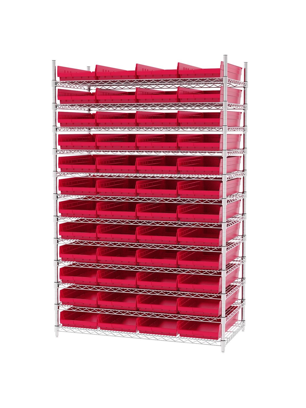 Shelf Bin Wire Systems can be configured for use with 36, 48, 60 or 96 bins providing a versatile system for storage and material handling. Durable and strong polypropylene shelf bins outlast corrugated bins. Bins available in Blue, Red, Yellow, or Semi-Clear. FOB Shipping Point.