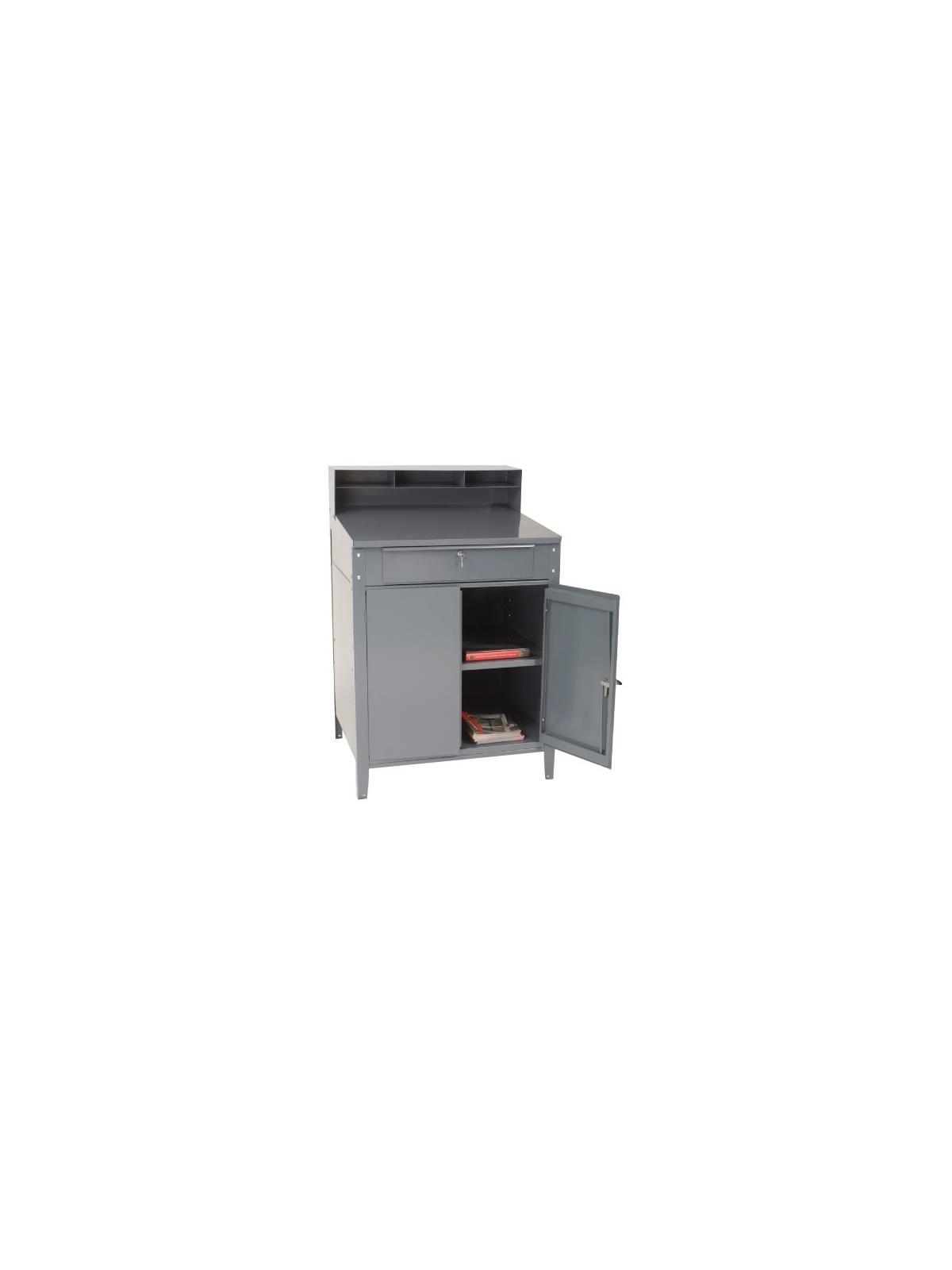 Three compartment work organizer is perfect for convenient access to supplies or documents. Ideal for shippers, checkers, dispatchers, mailrooms or receiving departments. Built for long, tough and sturdy service. Open Style Shop Desk shipped KD. Cabinet Style Shop Desk shipped assembled. Tough blended powder coat Gray paint finish. FOB Shipping Point.