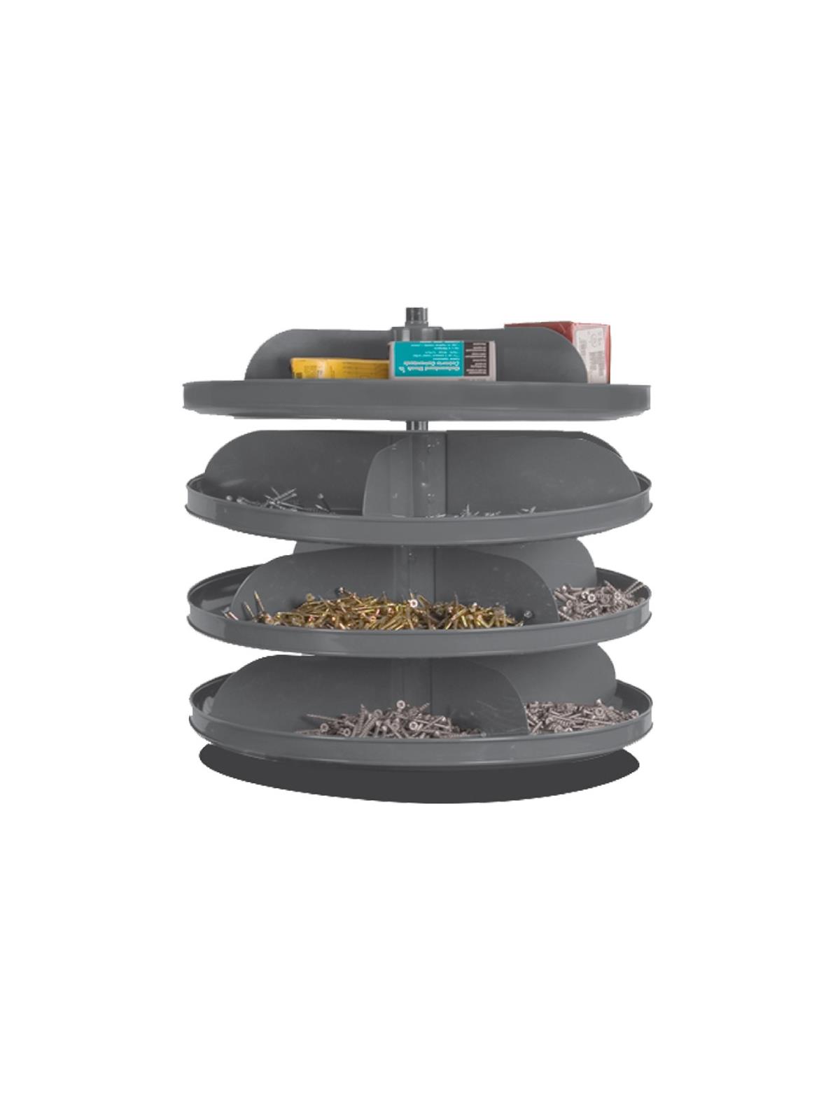 When space is at a premium, Rotabin® is the answer. Revolving shelves turn easily, independently...even when fully loaded. Made of heavy gauge steel for hard daily use. Available in Gray powder coat. FOB Shipping Point.