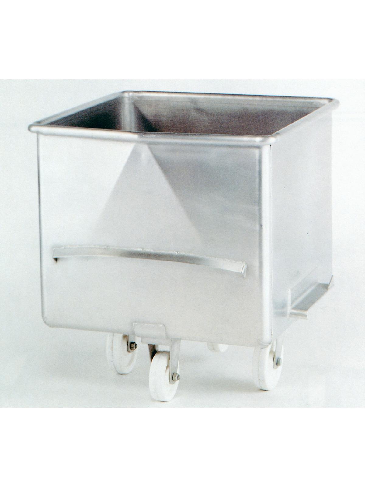 Made of 14 ga. Type 304 S.S. with 2B finish. Features full rolled top ring and special cast stainless corners. Easy to clean rounded inside corners. V-shaped front side with drip guard. Rugged constructed wheel mounting base. All welds heli-arced and blasted. FOB Shipping Point.