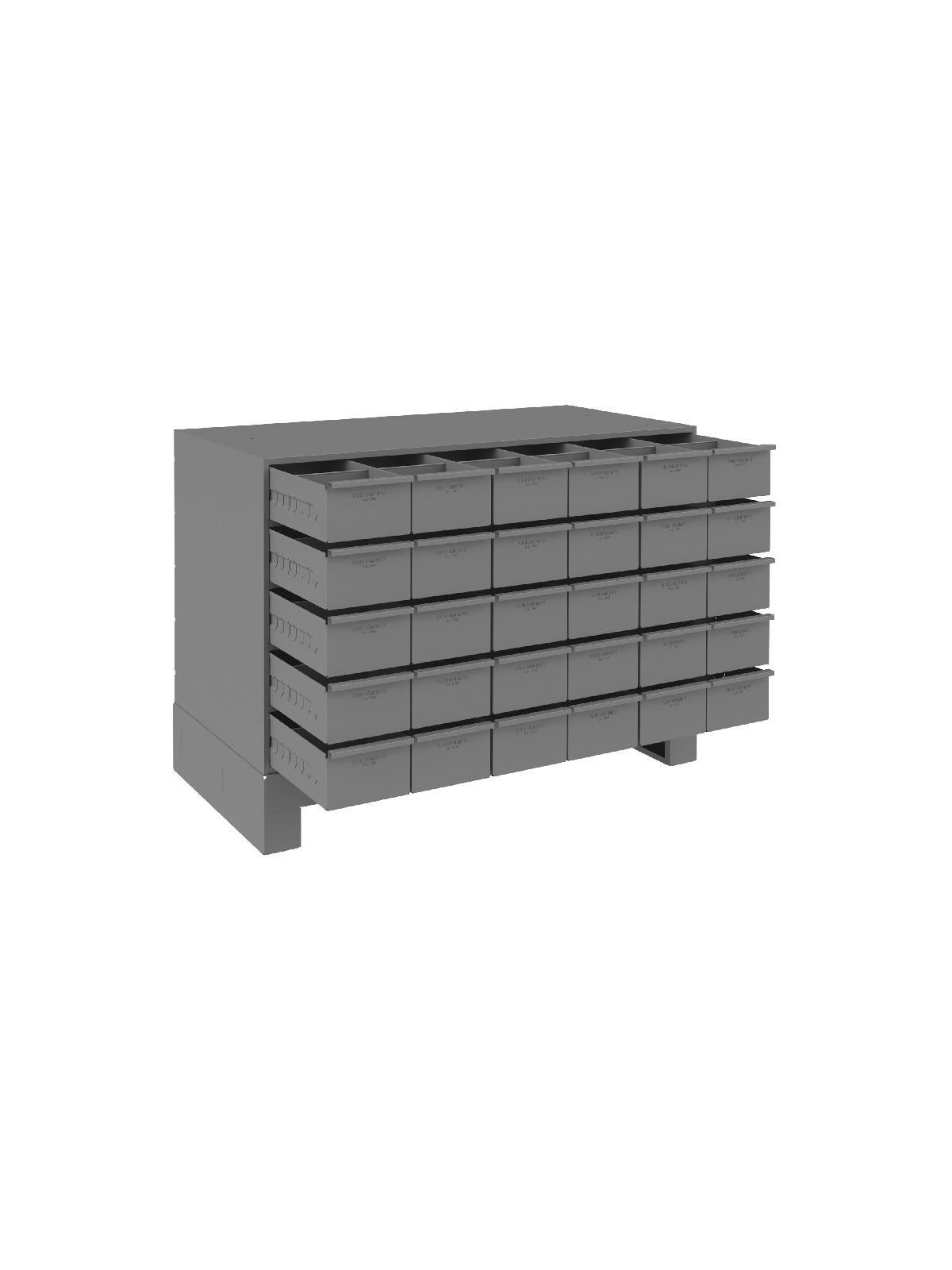 Full-width handle drawers open easily thanks to two embossed runners. Positive stop prevents spilling. Each drawer comes with 2 dividers. Shipped assembled. Includes base. Gray powder coat finish. FOB Shipping Point.