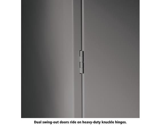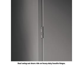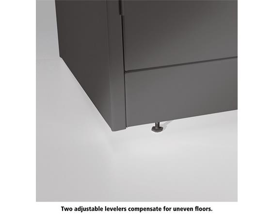 Knuckle hinges on each door insure the integrity of the cabinet and the alignment of the doors. Doors are reinforced for strength and quietness. Handle on right-hand door activates a 3-point system for added security; dummy handle on left-hand door. Shelves are adjustable in 2" increments on built-in shelf tabs. Shelves will hold up to 200 lbs. evenly distributed. Two front leveling glides compensate for uneven floors. Louvered back panel allows air circulation in the cabinet. Available in four models--storage, wardrobe, combination, and counter high cabinets. Available in Black, Champagne/Putty, Sand, Light Gray and Medium Gray. FOB Shipping Point.