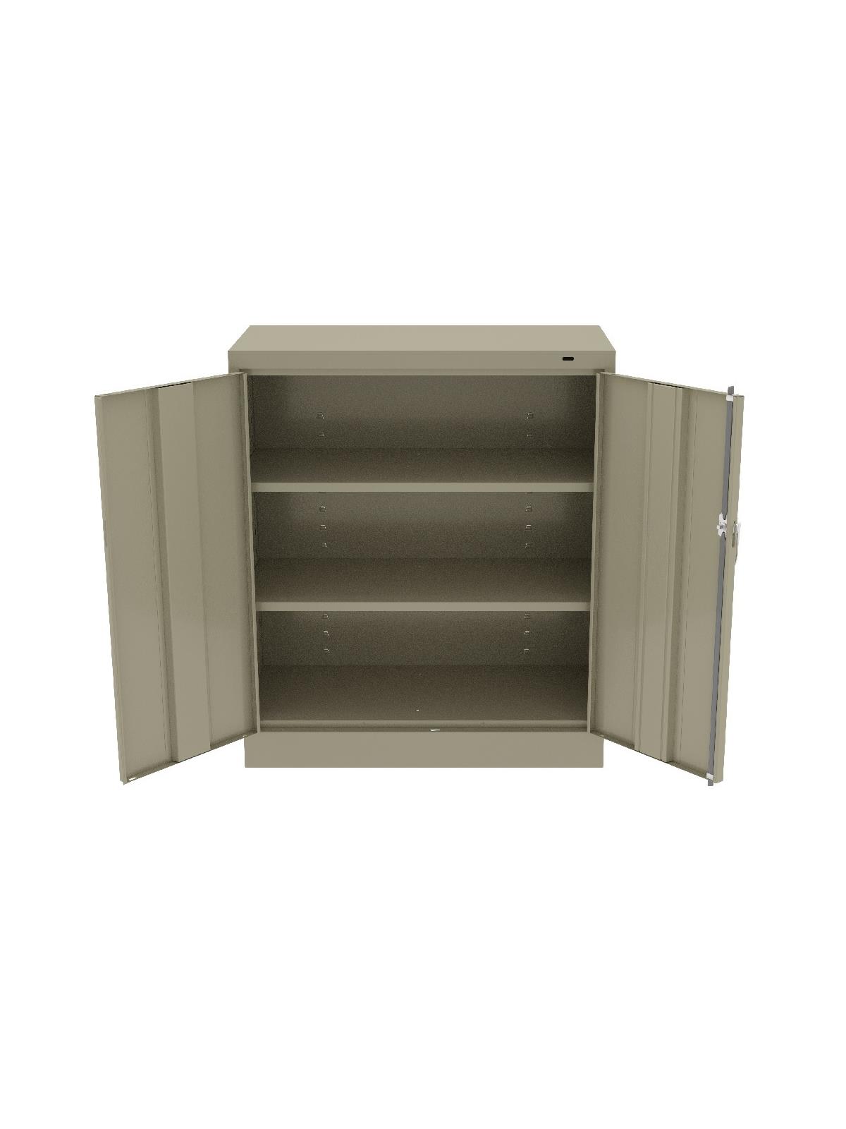 Knuckle hinges on each door insure the integrity of the cabinet and the alignment of the doors. Doors are reinforced for strength and quietness. Handle on right-hand door activates a 3-point system for added security; dummy handle on left-hand door. Shelves are adjustable in 2" increments on built-in shelf tabs. Shelves will hold up to 200 lbs. evenly distributed. Two front leveling glides compensate for uneven floors. Louvered back panel allows air circulation in the cabinet. Available in four models--storage, wardrobe, combination, and counter high cabinets. Available in Black, Champagne/Putty, Sand, Light Gray and Medium Gray. FOB Shipping Point.