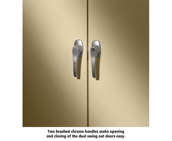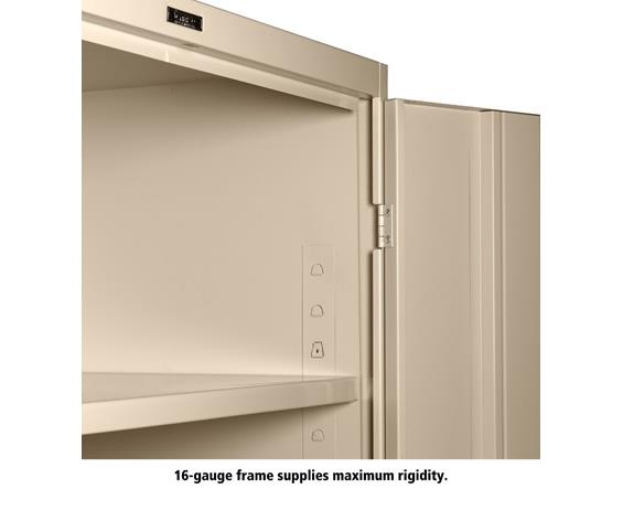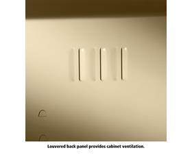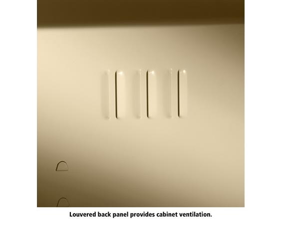Knuckle hinges on each door insure the integrity of the cabinet and the alignment of the doors. Doors are reinforced for strength and quietness. Handle on right-hand door activates a 3-point system for added security; dummy handle on left-hand door. Shelves are adjustable in 2" increments on built-in shelf tabs. Shelves will hold up to 200 lbs. evenly distributed. Two front leveling glides compensate for uneven floors. Louvered back panel allows air circulation in the cabinet. Available in four models--storage, wardrobe, combination, and counter high cabinets. Available in Black, Champagne/Putty, Sand, Light Gray and Medium Gray. FOB Shipping Point.