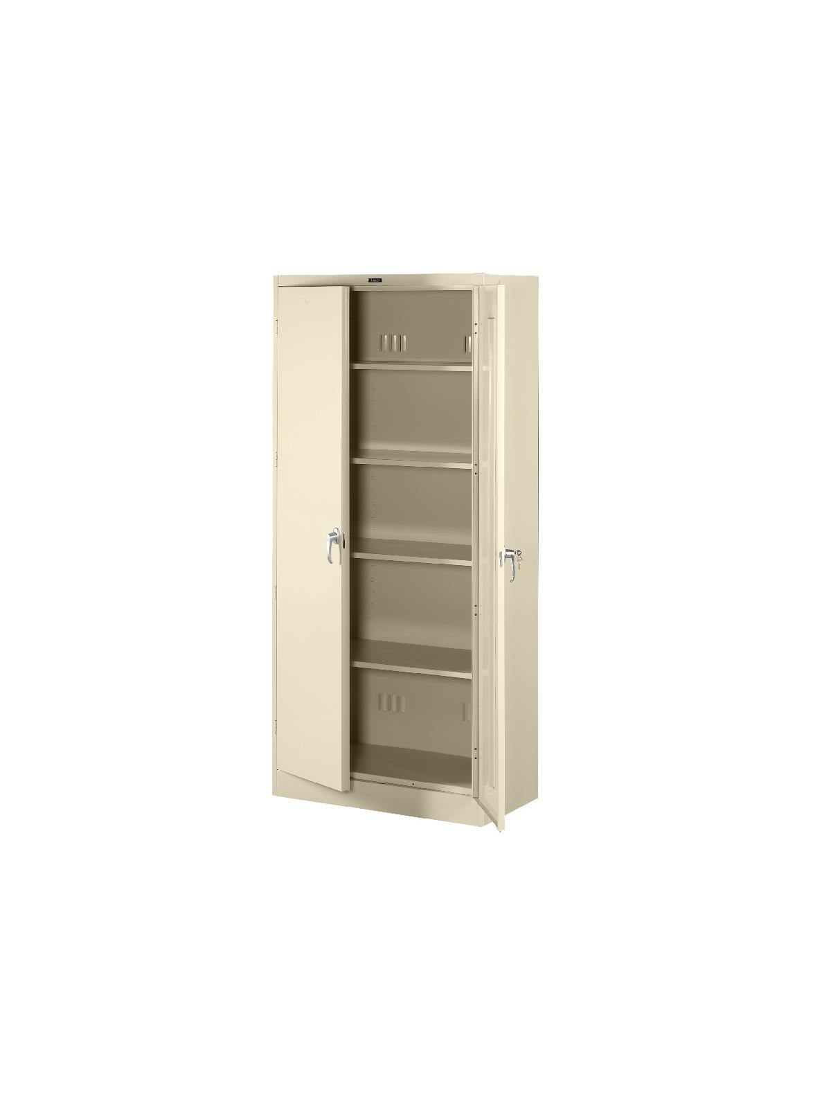 Knuckle hinges on each door insure the integrity of the cabinet and the alignment of the doors. Doors are reinforced for strength and quietness. Handle on right-hand door activates a 3-point system for added security; dummy handle on left-hand door. Shelves are adjustable in 2" increments on built-in shelf tabs. Shelves will hold up to 200 lbs. evenly distributed. Two front leveling glides compensate for uneven floors. Louvered back panel allows air circulation in the cabinet. Available in four models--storage, wardrobe, combination, and counter high cabinets. Available in Black, Champagne/Putty, Sand, Light Gray and Medium Gray. FOB Shipping Point.