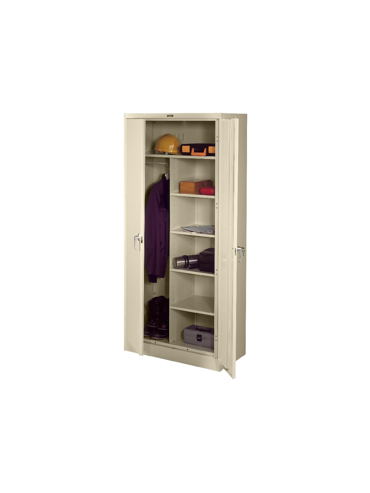 Knuckle hinges on each door insure the integrity of the cabinet and the alignment of the doors. Doors are reinforced for strength and quietness. Handle on right-hand door activates a 3-point system for added security; dummy handle on left-hand door. Shelves are adjustable in 2" increments on built-in shelf tabs. Shelves will hold up to 200 lbs. evenly distributed. Two front leveling glides compensate for uneven floors. Louvered back panel allows air circulation in the cabinet. Available in four models--storage, wardrobe, combination, and counter high cabinets. Available in Black, Champagne/Putty, Sand, Light Gray and Medium Gray. FOB Shipping Point.