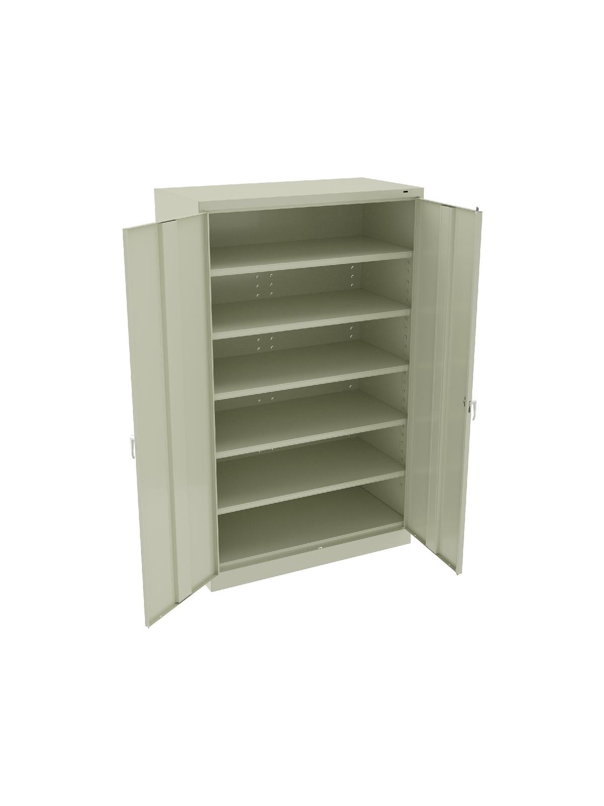 Jumbo size for jumbo storage capacity. Two front leveling glides compensate for uneven floors. Four leaf hinges on each door insure the integrity of the cabinet and the alignment of the doors. Handle on right-hand door activates a three-point locking system for added security -- second handle on left-hand door. Shelves are adjustable in 2" increments on built-in shelf tabs. Shelves hold up to 400 lbs. evenly distributed. Unassembled cabinets ship in 2 cartons. Available in Black, Champagne/Putty, Sand, Light Gray and Medium Gray. FOB Shipping Point.