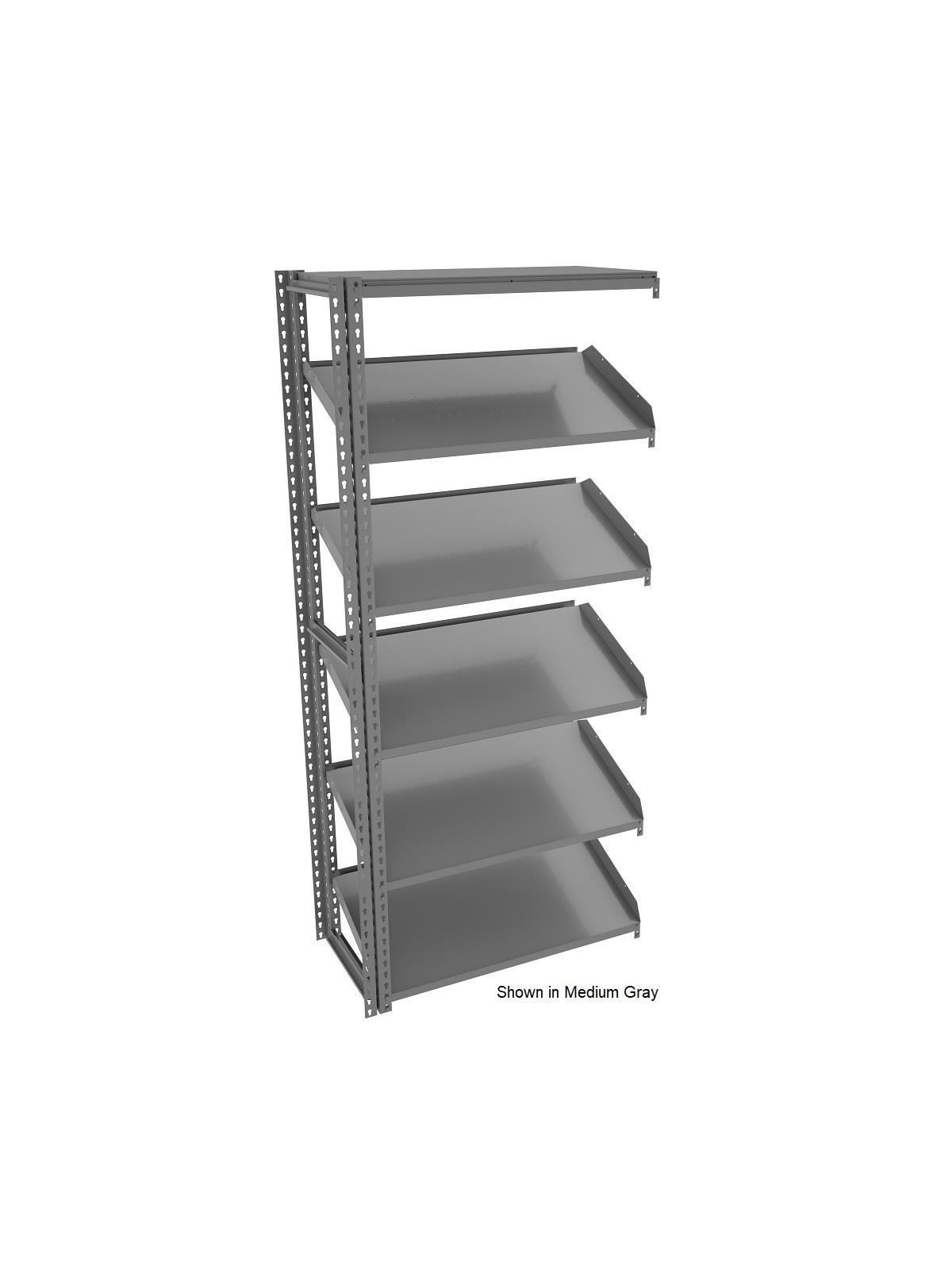 Parts, bins and boxes slide forward for easy picking. Open access from all sides. Place back to back to double shelf depth. Canopy top has box formed construction. Features 2" side flange to retain product. 1/2" front lip acts as a product stop. Heavy gauge shelf supports. Shelves support up to 450 lb. loads. Boltless construction - easy assembly with only a mallet. 5 sloping steel shelves per unit. 18"D. shelves slope 12 degrees. 24"D. shelves slope 14 degrees. Starter unit can be used individually or combined with adder units to form a row of shelving. Medium Gray or Sand finish. FOB Shipping Point.