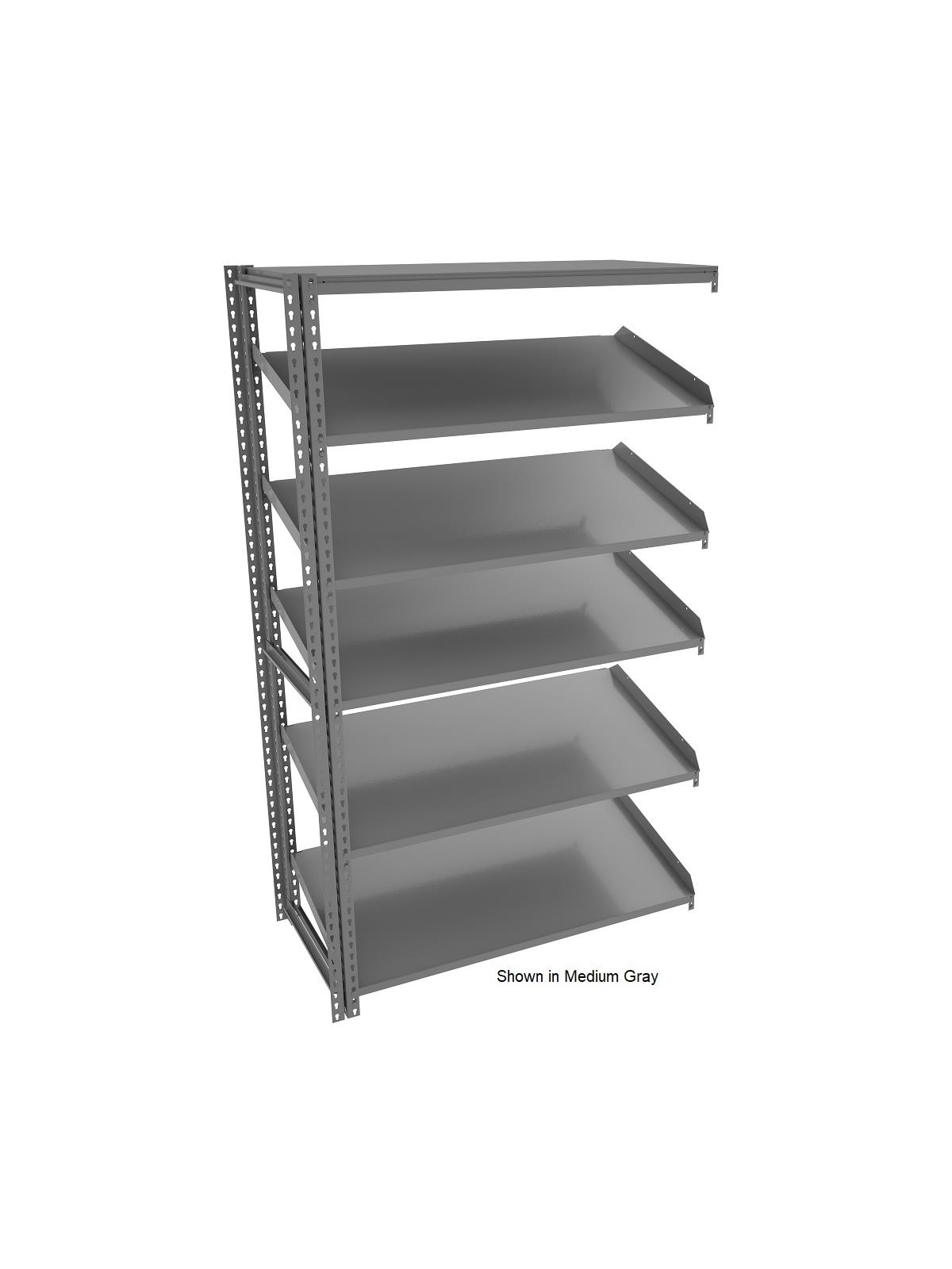 Parts, bins and boxes slide forward for easy picking. Open access from all sides. Place back to back to double shelf depth. Canopy top has box formed construction. Features 2" side flange to retain product. 1/2" front lip acts as a product stop. Heavy gauge shelf supports. Shelves support up to 450 lb. loads. Boltless construction - easy assembly with only a mallet. 5 sloping steel shelves per unit. 18"D. shelves slope 12 degrees. 24"D. shelves slope 14 degrees. Starter unit can be used individually or combined with adder units to form a row of shelving. Medium Gray or Sand finish. FOB Shipping Point.