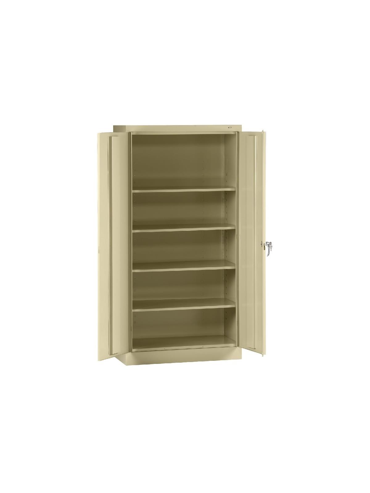 Shelves adjust in 2" increments. Heavy-steel construction with leaf hinges and reinforced doors stand up to a lifetime of heavy use. Handle on right-hand door activates the three-point locking system to keep belongings secure. Raised base keeps contents from contacting moisture from the floor. Available in 3 models--storage, wardrobe and combination. Available in Black, Champagne/Putty, Sand, Light Gray and Medium Gray. FOB Shipping Point.