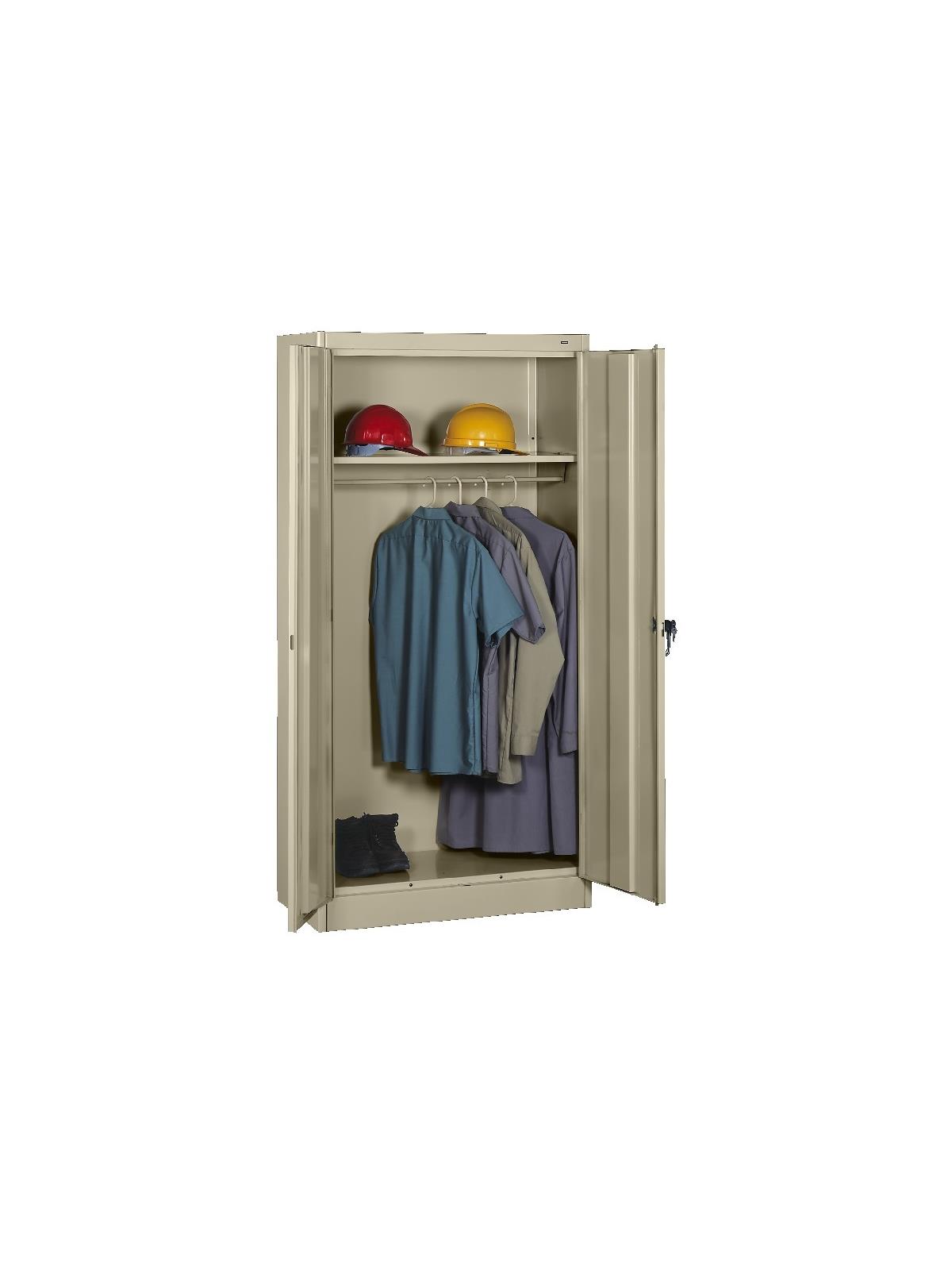 Shelves adjust in 2" increments. Heavy-steel construction with leaf hinges and reinforced doors stand up to a lifetime of heavy use. Handle on right-hand door activates the three-point locking system to keep belongings secure. Raised base keeps contents from contacting moisture from the floor. Available in 3 models--storage, wardrobe and combination. Available in Black, Champagne/Putty, Sand, Light Gray and Medium Gray. FOB Shipping Point.