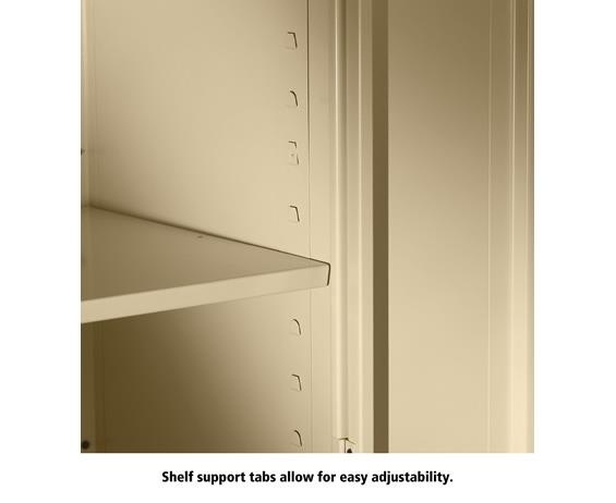 Shelves adjust in 2" increments. Heavy-steel construction with leaf hinges and reinforced doors stand up to a lifetime of heavy use. Handle on right-hand door activates the three-point locking system to keep belongings secure. Raised base keeps contents from contacting moisture from the floor. Available in 3 models--storage, wardrobe and combination. Available in Black, Champagne/Putty, Sand, Light Gray and Medium Gray. FOB Shipping Point.