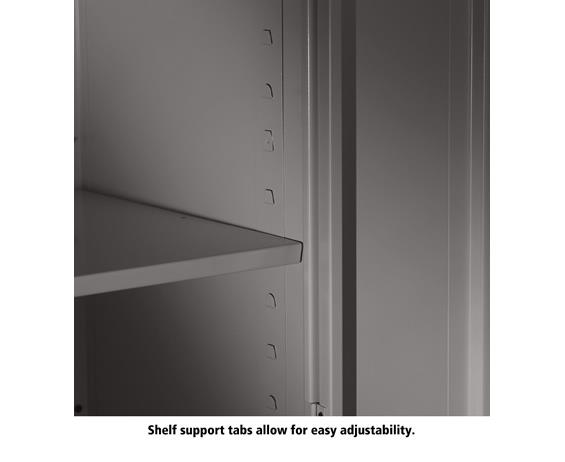 Shelves adjust in 2" increments. Heavy-steel construction with leaf hinges and reinforced doors stand up to a lifetime of heavy use. Handle on right-hand door activates the three-point locking system to keep belongings secure. Raised base keeps contents from contacting moisture from the floor. Available in 3 models--storage, wardrobe and combination. Available in Black, Champagne/Putty, Sand, Light Gray and Medium Gray. FOB Shipping Point.