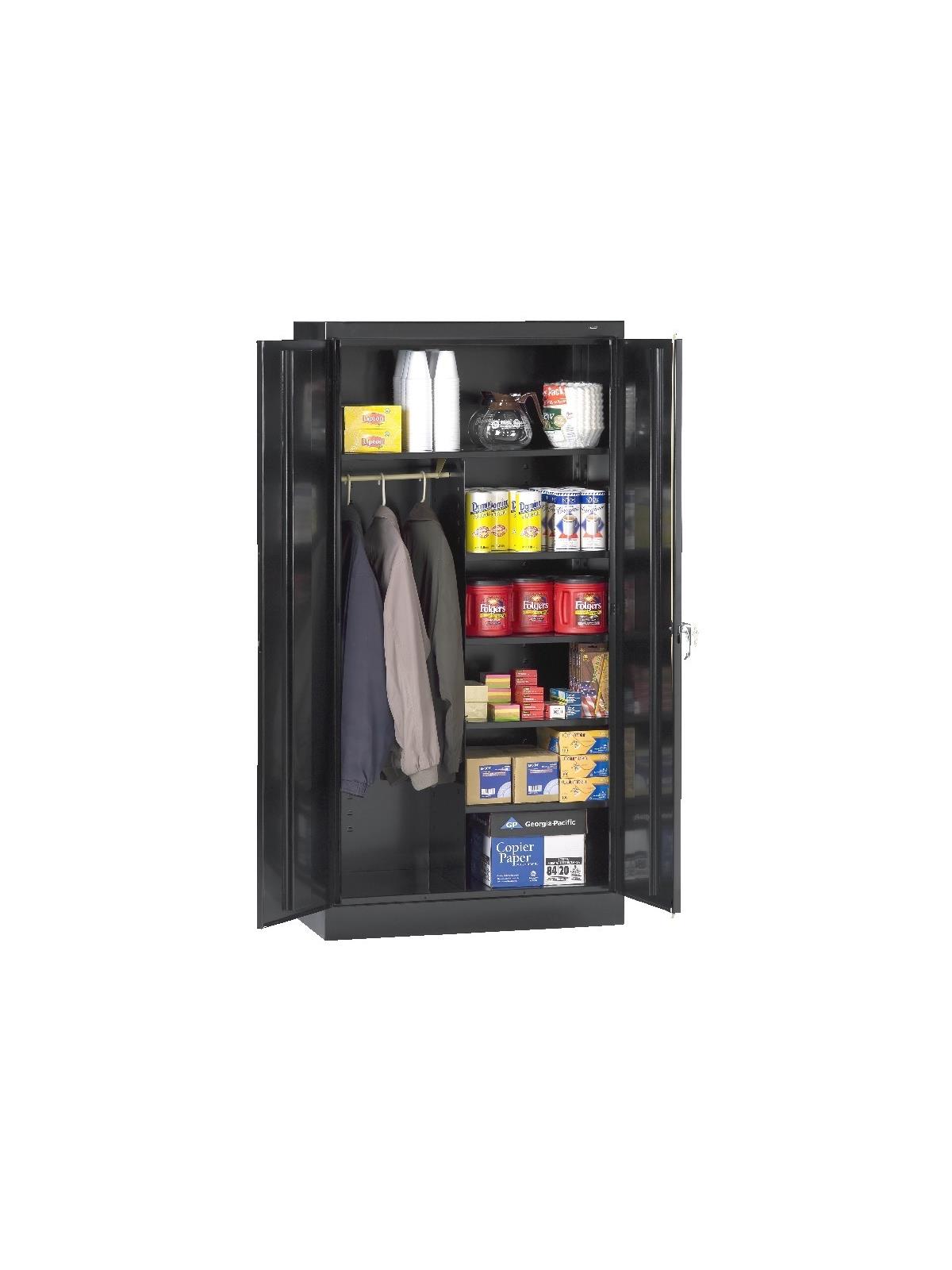 Shelves adjust in 2" increments. Heavy-steel construction with leaf hinges and reinforced doors stand up to a lifetime of heavy use. Handle on right-hand door activates the three-point locking system to keep belongings secure. Raised base keeps contents from contacting moisture from the floor. Available in 3 models--storage, wardrobe and combination. Available in Black, Champagne/Putty, Sand, Light Gray and Medium Gray. FOB Shipping Point.