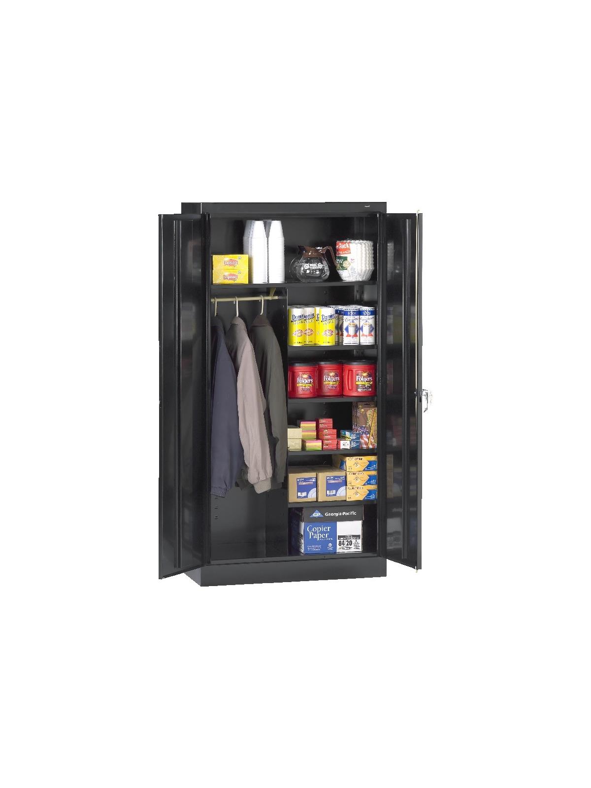 Shelves adjust in 2" increments. Heavy-steel construction with leaf hinges and reinforced doors stand up to a lifetime of heavy use. Handle on right-hand door activates the three-point locking system to keep belongings secure. Raised base keeps contents from contacting moisture from the floor. Available in 3 models--storage, wardrobe and combination. Available in Black, Champagne/Putty, Sand, Light Gray and Medium Gray. FOB Shipping Point.