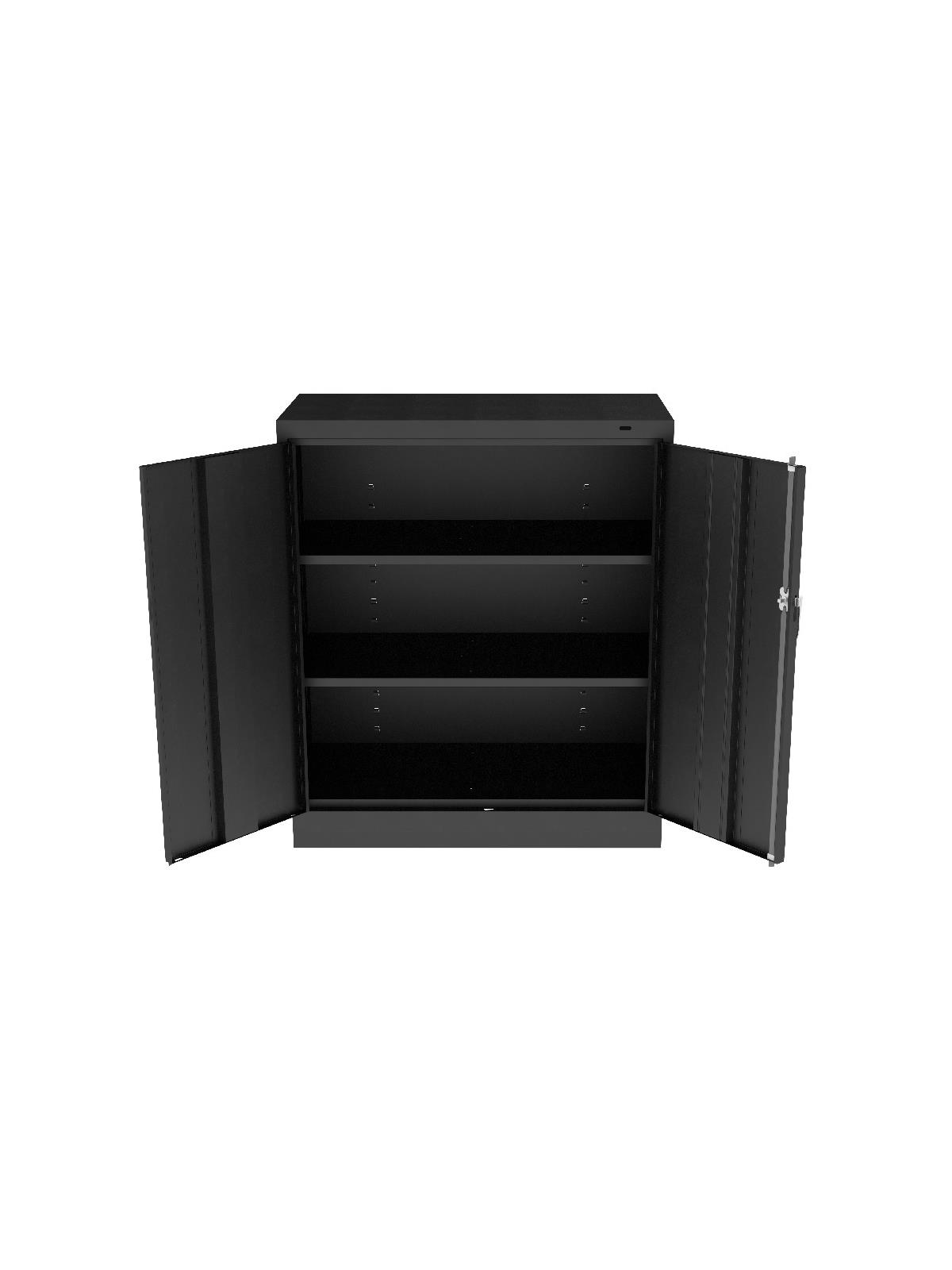 Shelves adjust in 2" increments. Heavy-steel construction with leaf hinges and reinforced doors stand up to a lifetime of heavy use. Handle on right-hand door activates the three-point locking system to keep belongings secure. Raised base keeps contents from contacting moisture from the floor. Available in Black, Champagne/Putty (shown), Sand, Light Gray and Medium Gray (shown). FOB Shipping Point.