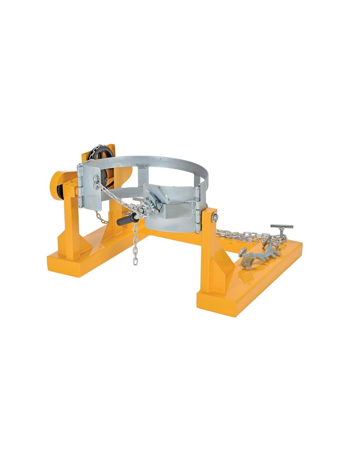 Safety restraint securely attaches to forklift. Drums must be full to rotate at rated capacity. Fork pockets measure 7"W x 2-5/8"H I.D. on 31-3/8" centers. Rotates manually - a 15' chain runs back to driver. FOB Shipping Point.